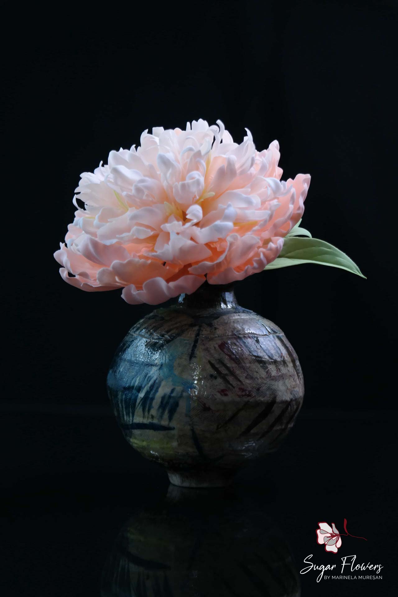 Bujorul din imagine, modelat din pasta de zahar, este format din 50 de petale de marimi diferite. Diametrul sau ajunge la aproximativ 11-12 cm. Nu este o floare complicata, dar este consumatoare de timp, avand un numar mare de petale.