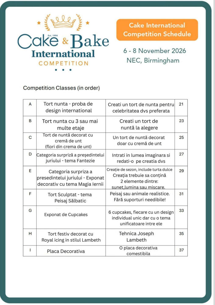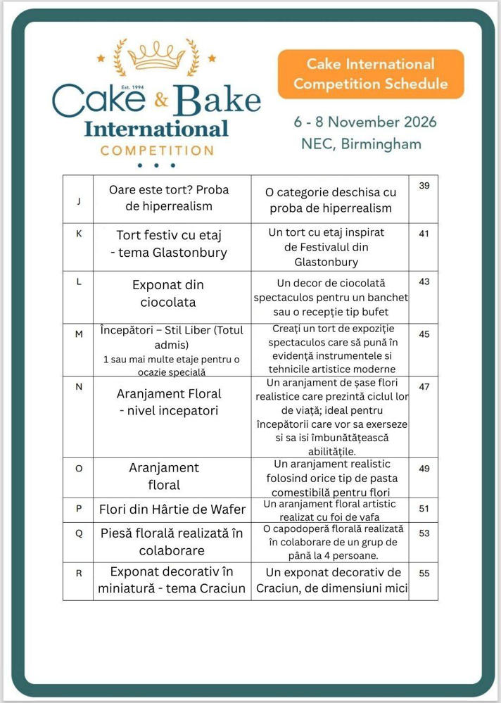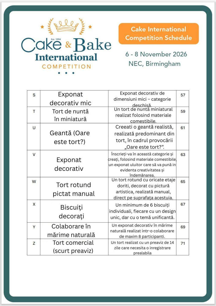 Pentru regulamentul complet al competiției și înscrieri, accesați link-ul oficial: https://www.cakeinternational.co.uk/competitions/
