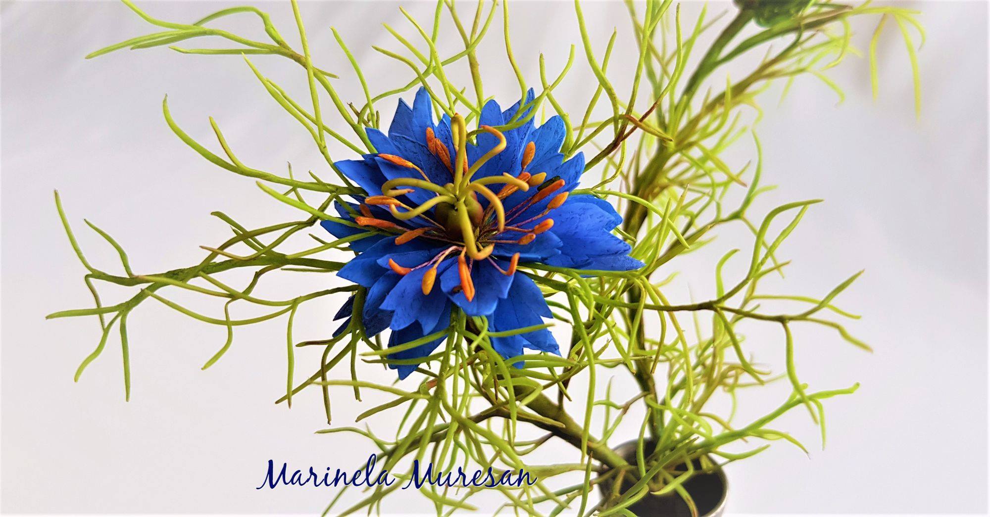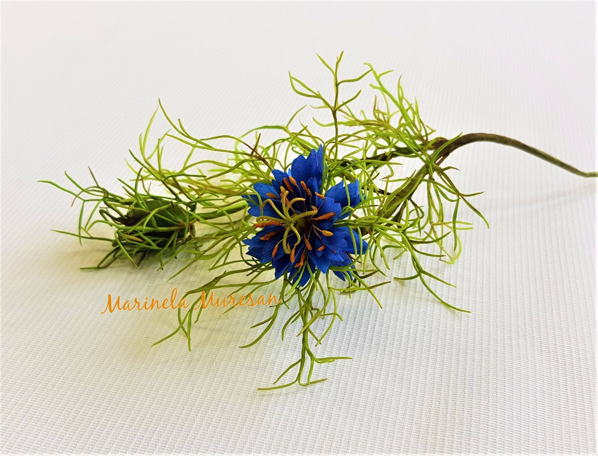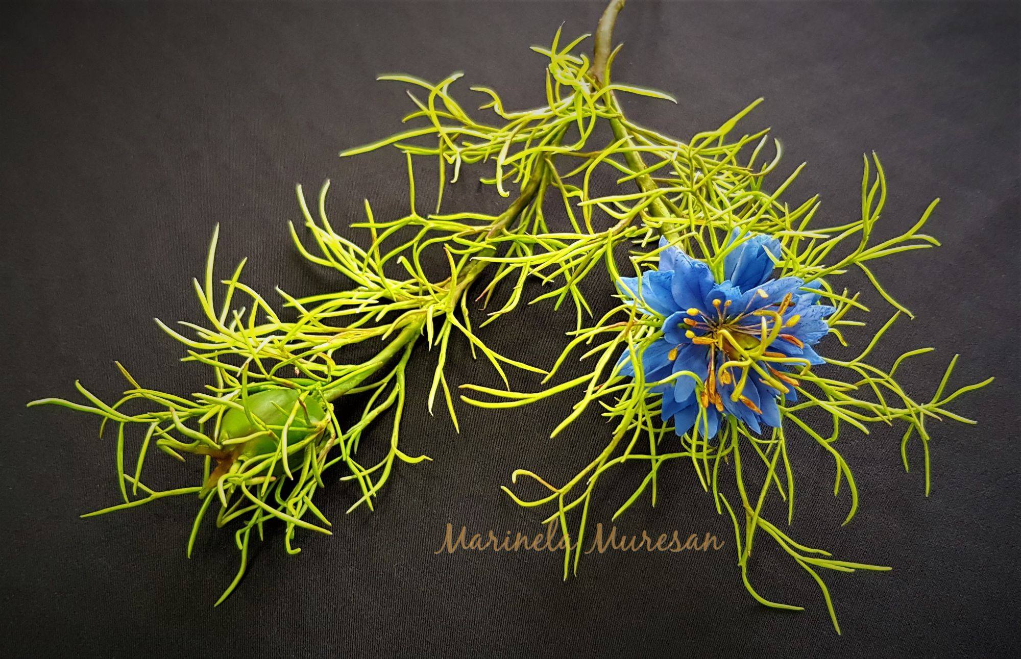 Modelul meu natural a avut flori albastre. Dar specia se gaseste si in alte variante, cu flori albe, mov, roz si purpuriu.Avand proprietati vindecatoare, aceasta planta este cunoscuta inca din vechime. A fost cultivata in India si Egipt, in Orientul Apropiat si Mijlociu, fiind mentionata chiar in scrierile Vechiului Testament, asa cum se precizeaza pe blogul ierburiuitate.wordpress.com. Se pare ca seminte de Nigella au fost gasite chiar in mormantul lui Tuthankamon.