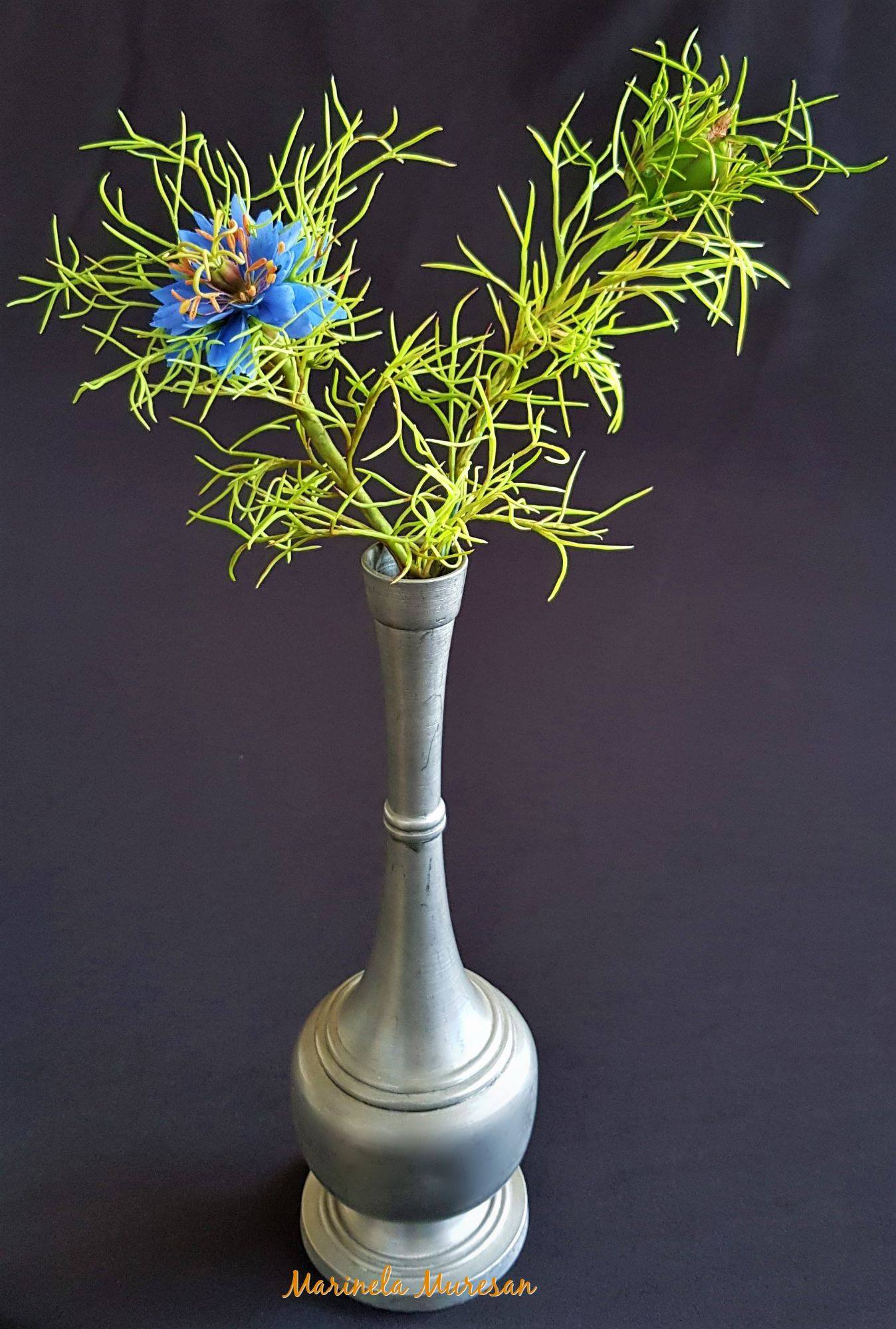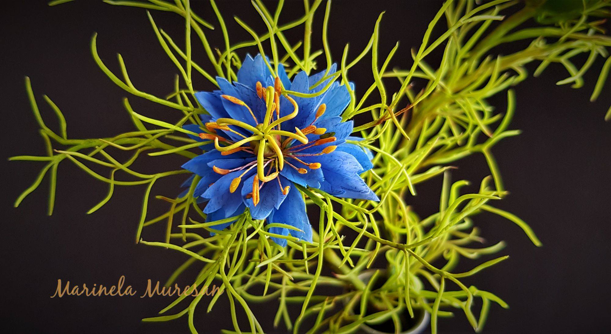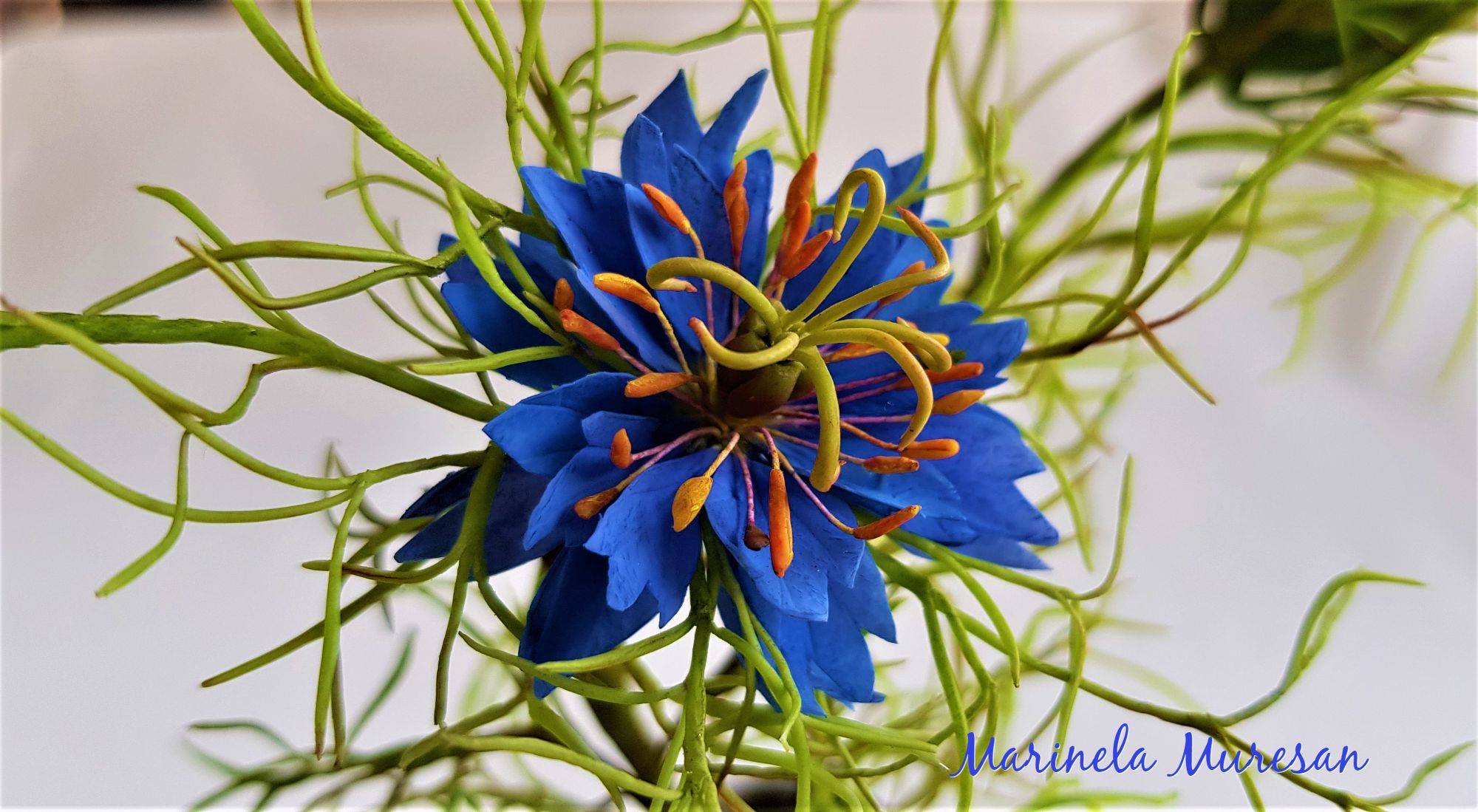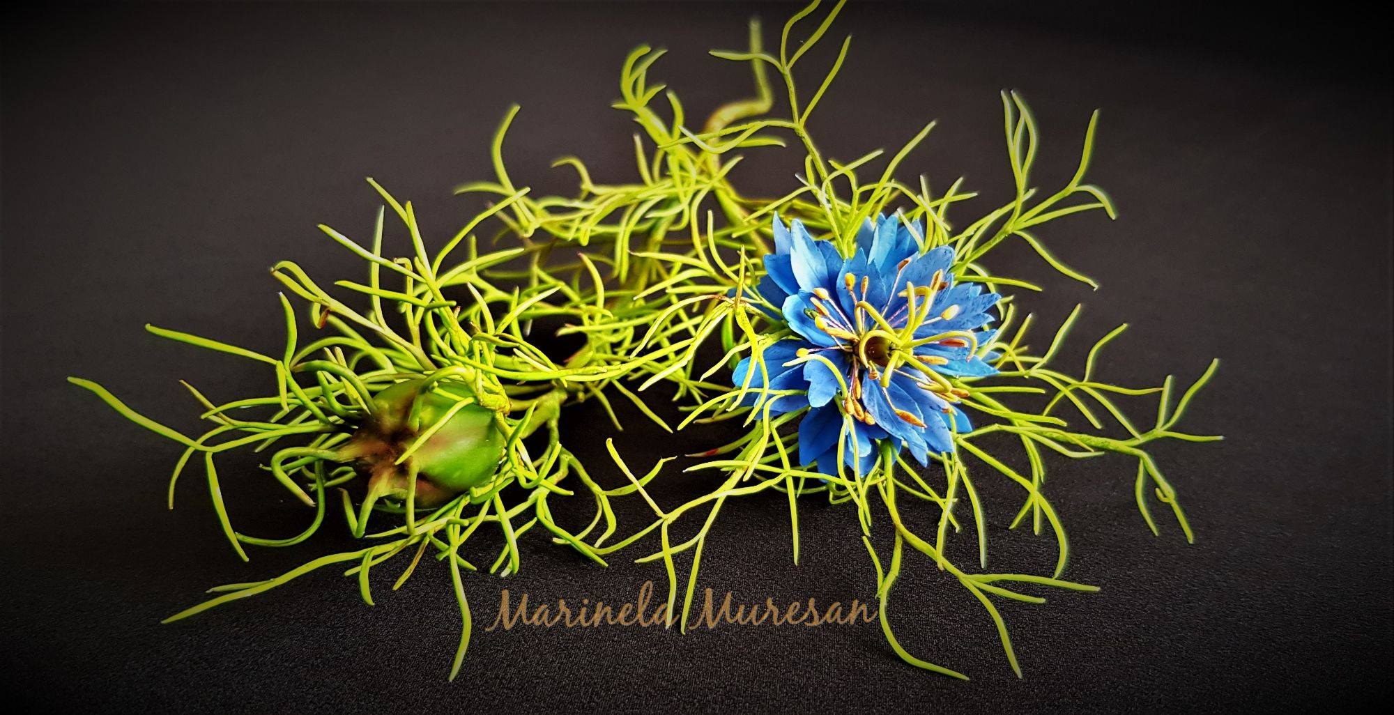 Modelul meu natural a avut flori albastre. Dar specia se gaseste si in alte variante, cu flori albe, mov, roz si purpuriu.Avand proprietati vindecatoare, aceasta planta este cunoscuta inca din vechime. A fost cultivata in India si Egipt, in Orientul Apropiat si Mijlociu, fiind mentionata chiar in scrierile Vechiului Testament, asa cum se precizeaza pe blogul ierburiuitate.wordpress.com. Se pare ca seminte de Nigella au fost gasite chiar in mormantul lui Tuthankamon.