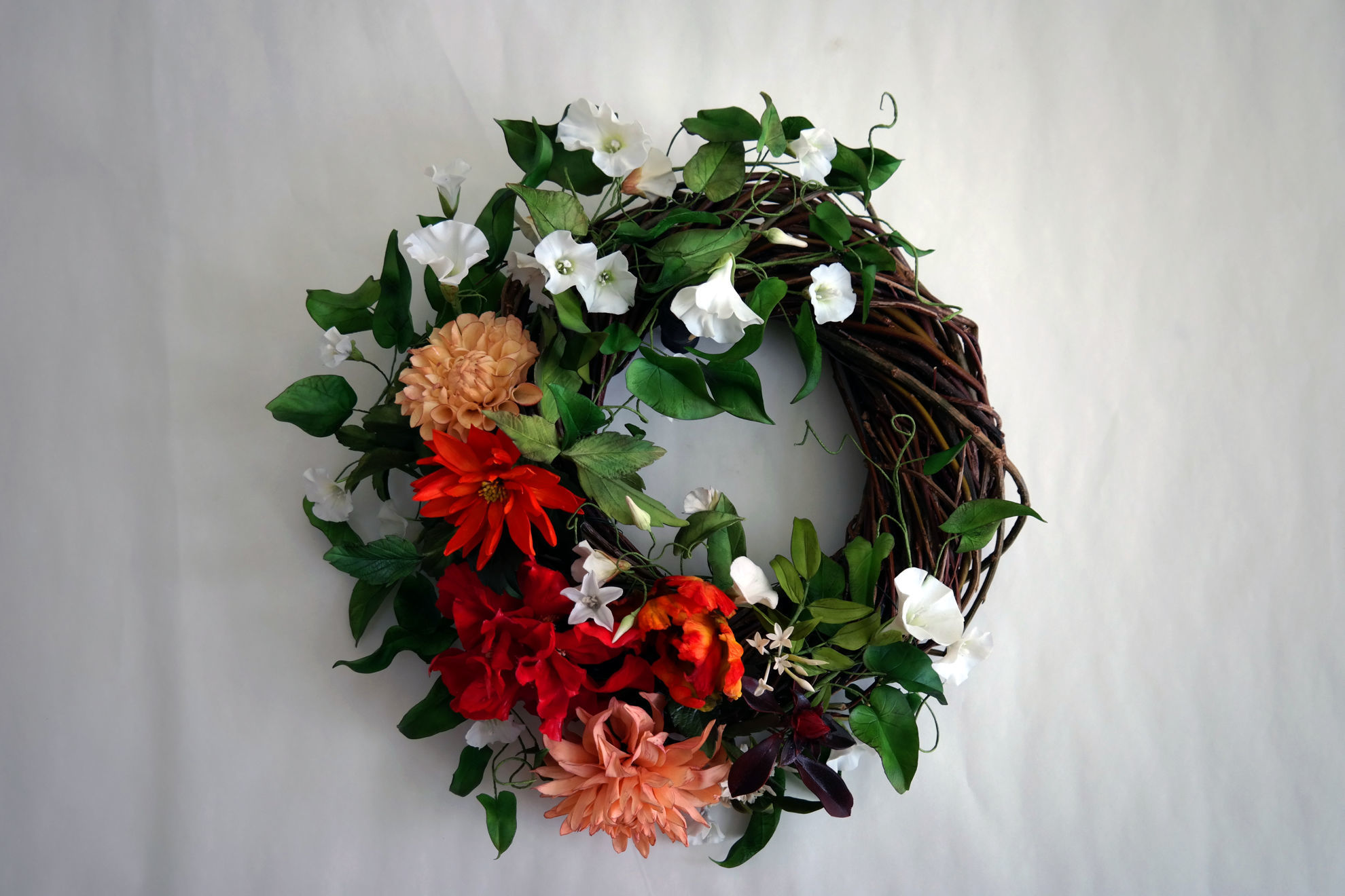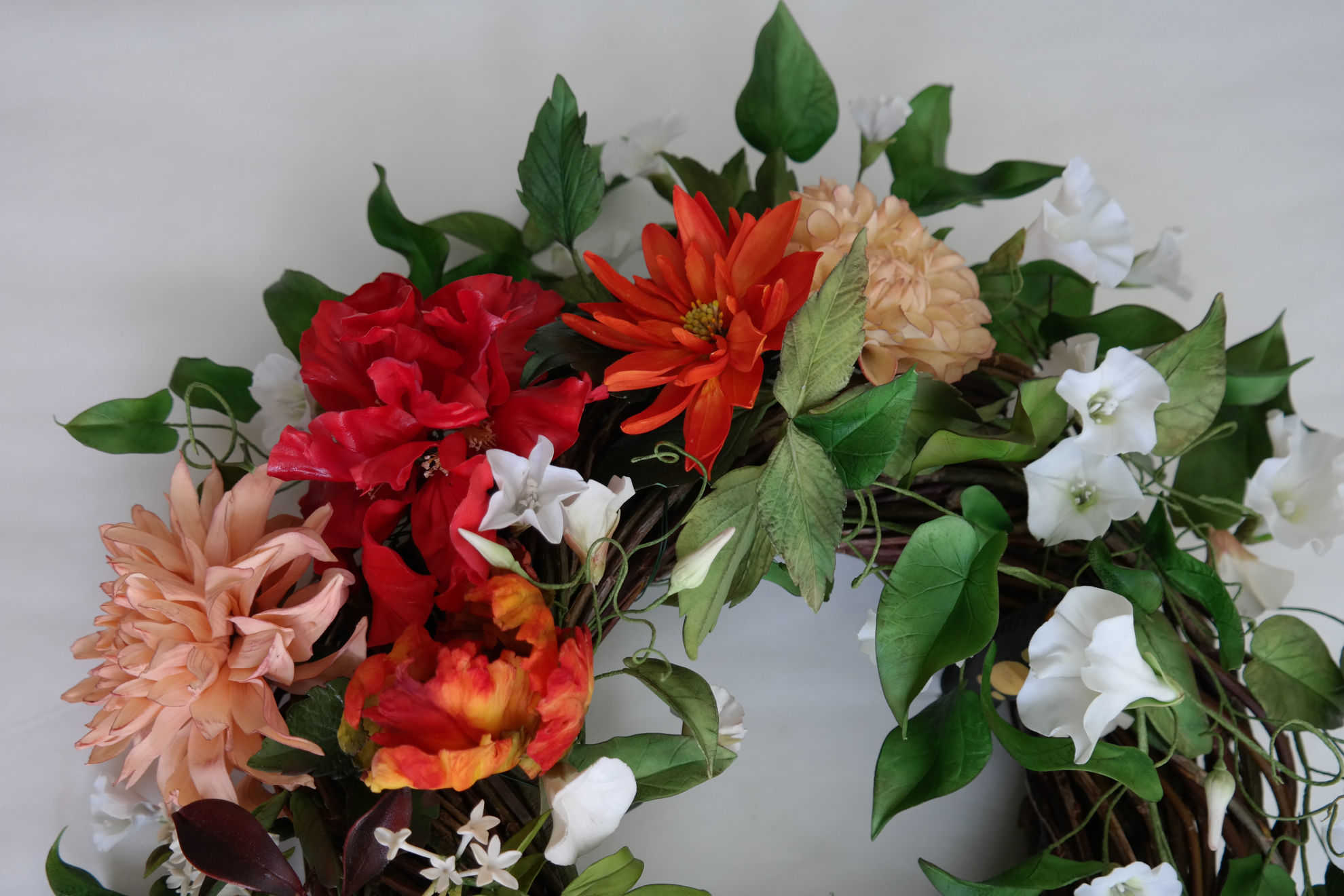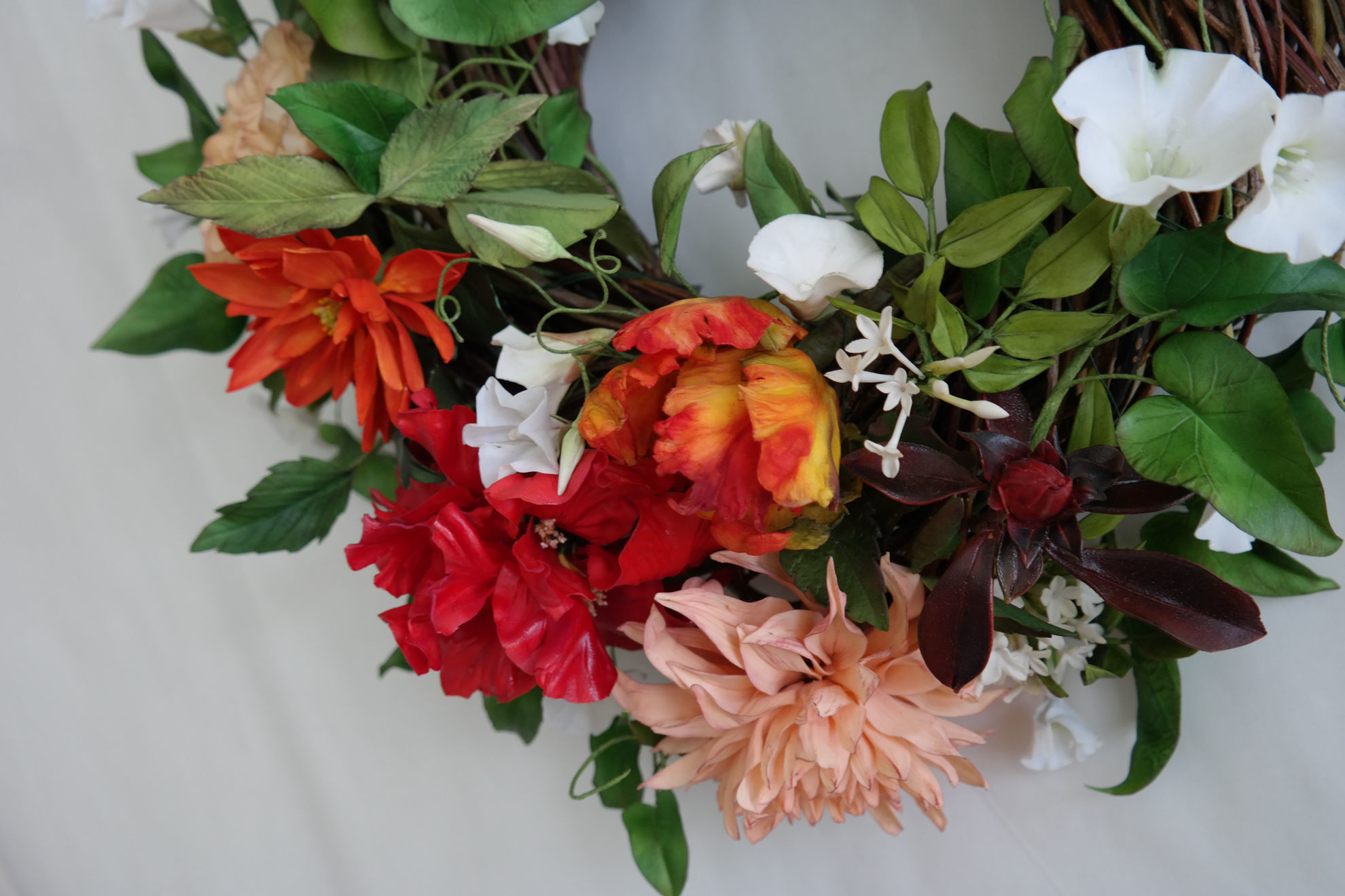 Specii: Helleborus, Dalie, Hibiscus, Volbura (Rochita-randunicii), Lalea papagal, Iasomie de Madagascar.