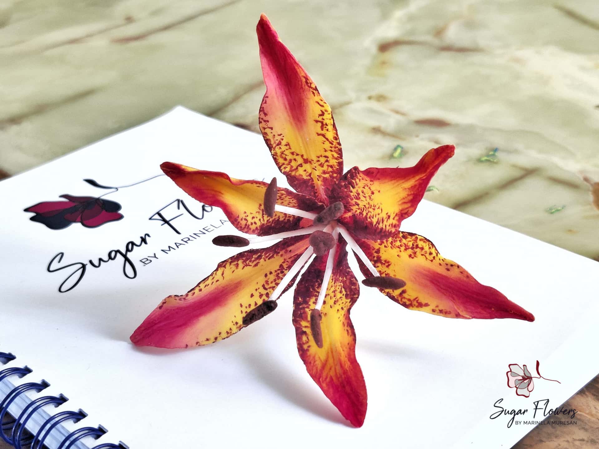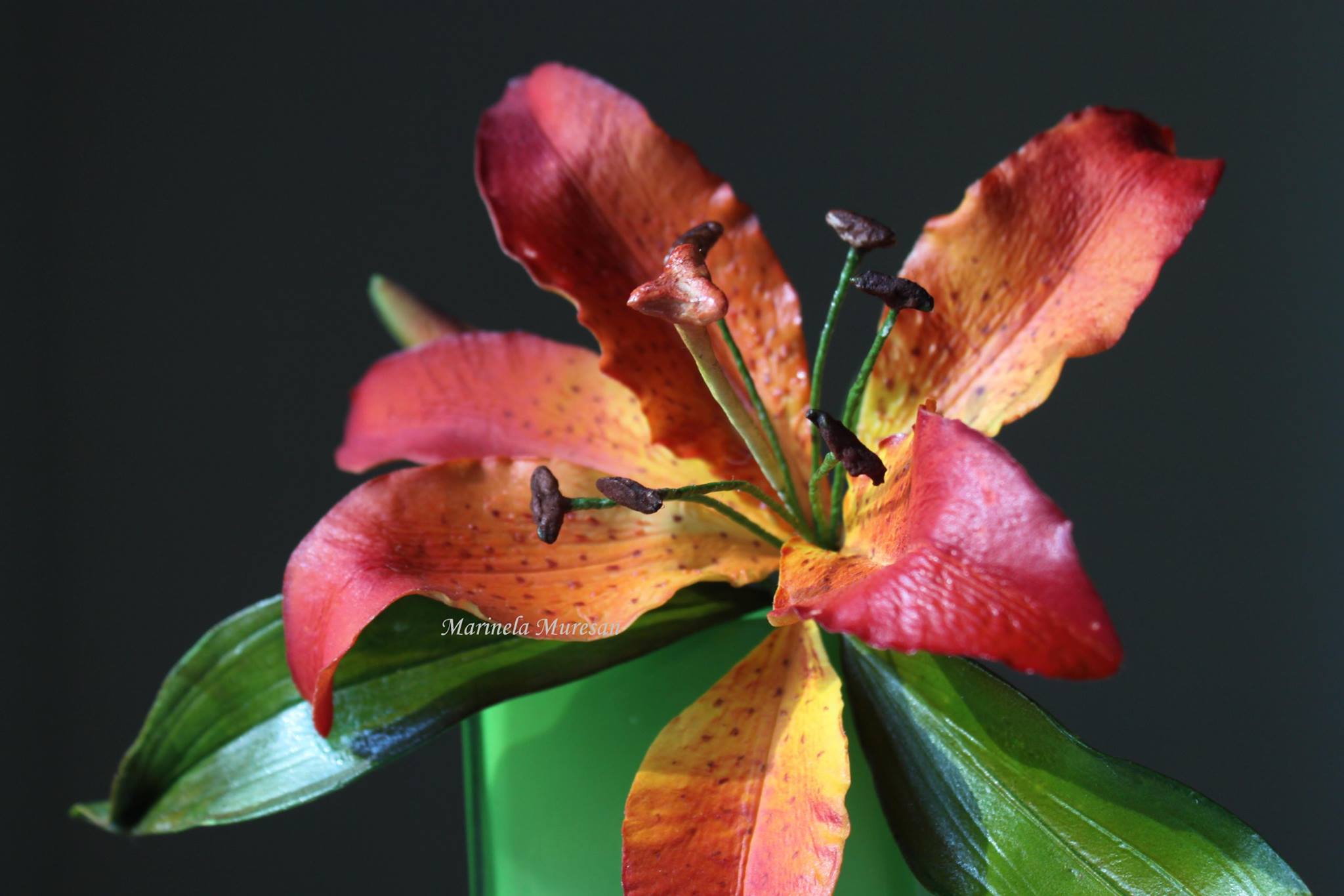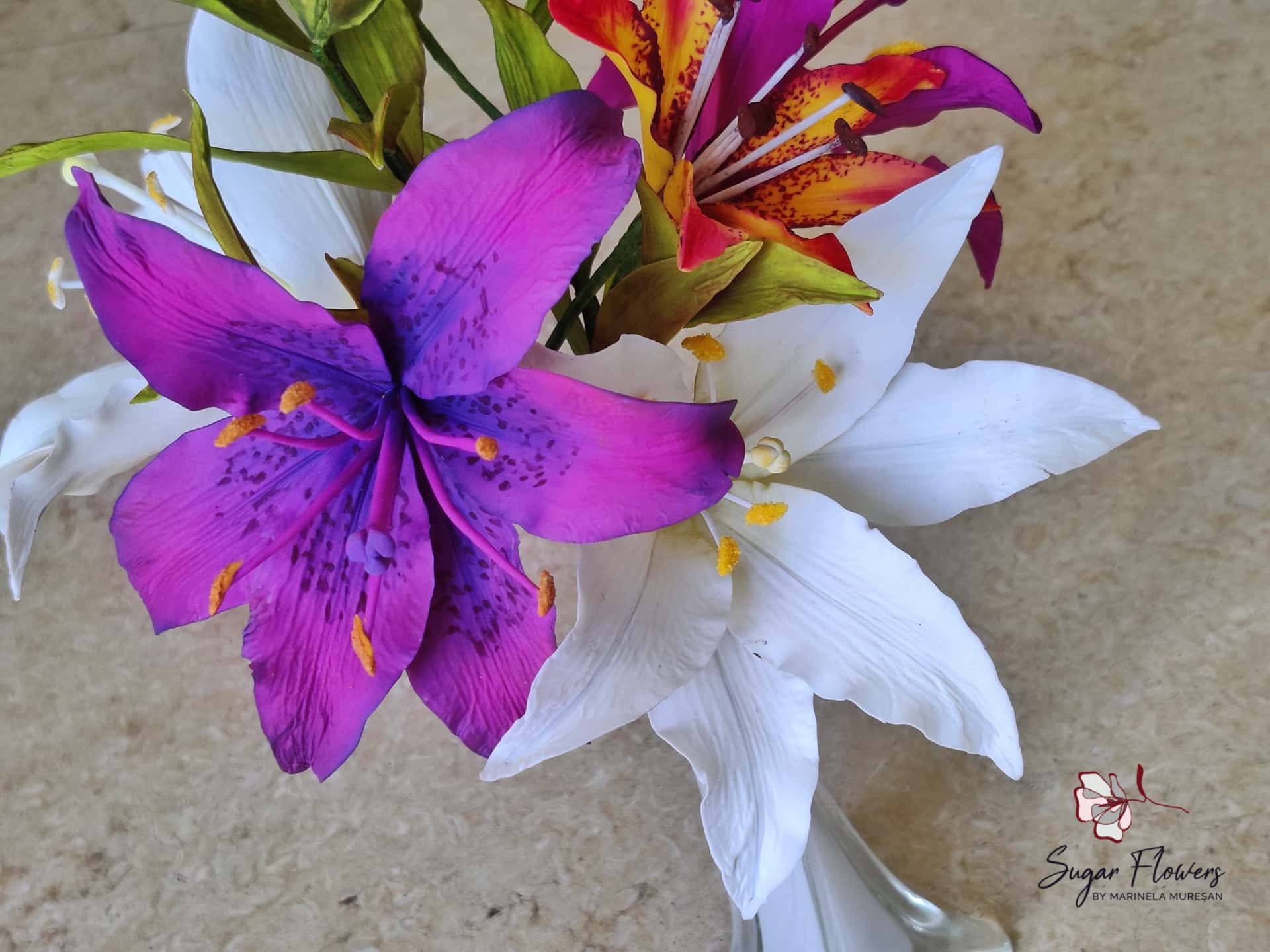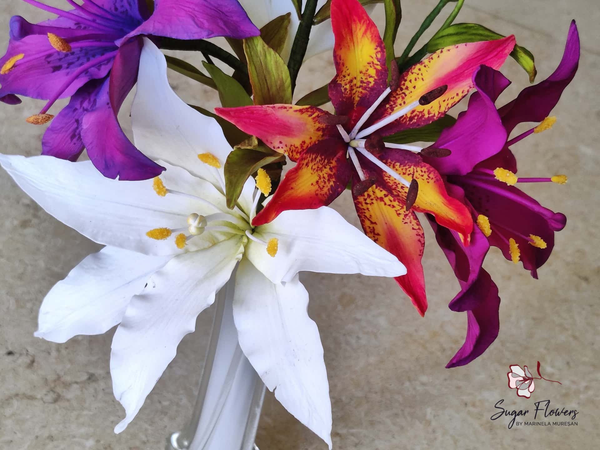 Crinul (Lilium regale) este o floare simpla, dar spectaculoasa prin forma si colorit. Pentru ca este o floare relativ mare, avand un diametru de aproximativ 15 cm, crinul este atractiv si foarte eficient pt.decorurile comestibile. Pentru modelarea unei astfel de flori, sunt necesare 6 petale, plus 2-3 frunze. Aspectul natural, realist al petalelor si frunzelor de zahar este dat de decupatoarele si veinerele(matritele) specifice utilizate. Culorile crinului asiatic sunt foarte variate, mergand de la alb pana la aproape negru. Eu am ales o combinatie de culori rosu-orange-galben, culori calde si pline de viata, care transmit bucurie si dau o stare de bine.