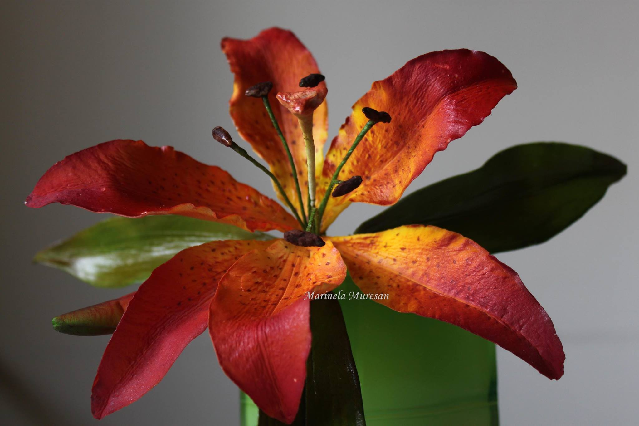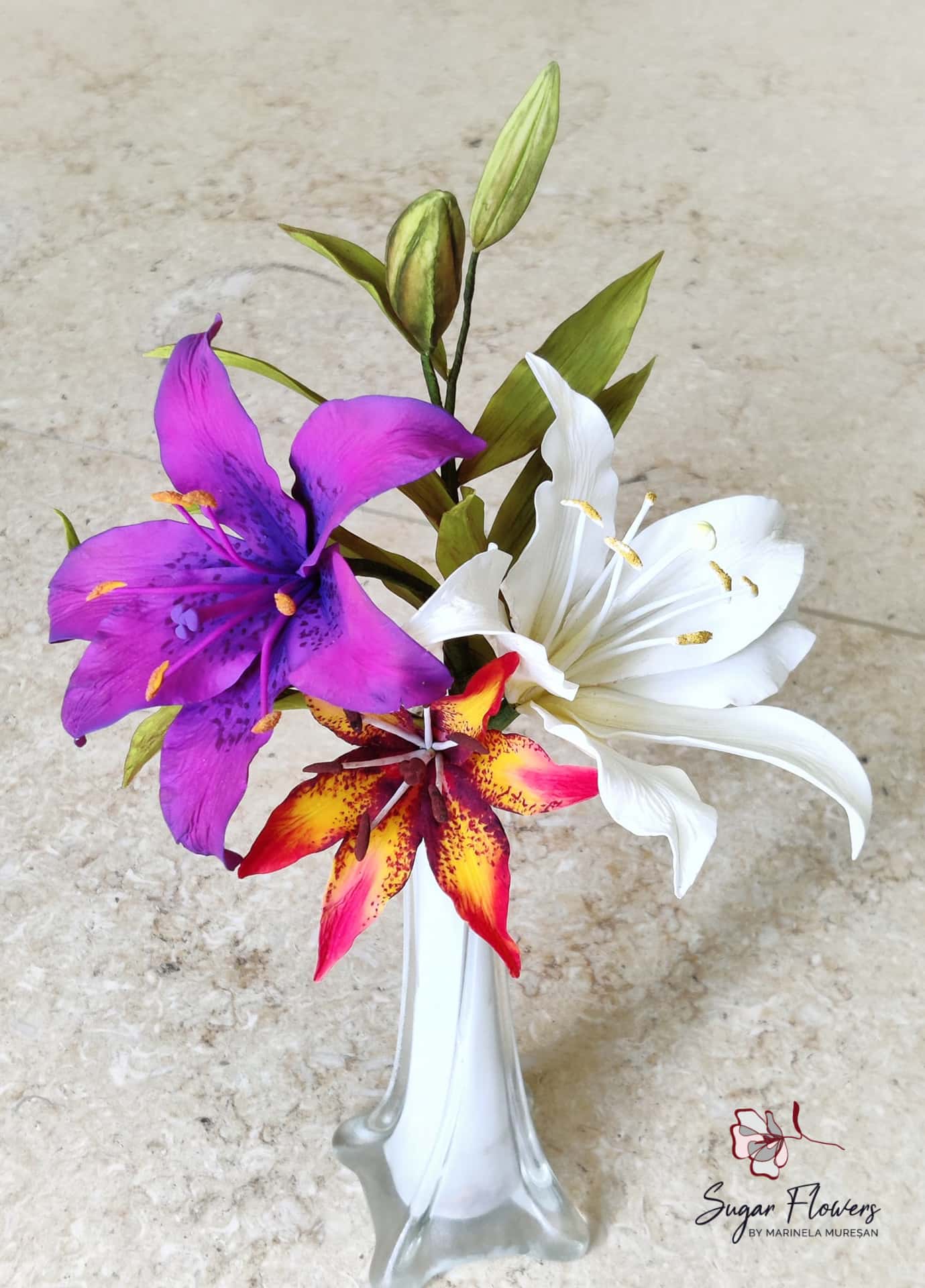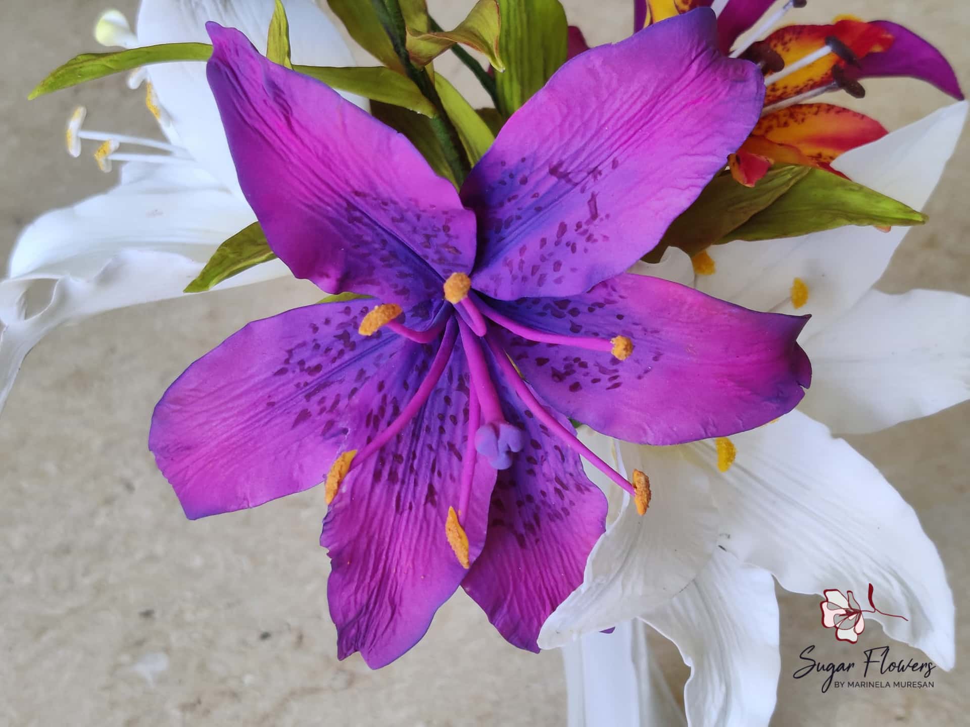 Crinul (Lilium regale) este o floare simpla, dar spectaculoasa prin forma si colorit. Pentru ca este o floare relativ mare, avand un diametru de aproximativ 15 cm, crinul este atractiv si foarte eficient pt.decorurile comestibile. Pentru modelarea unei astfel de flori, sunt necesare 6 petale, plus 2-3 frunze. Aspectul natural, realist al petalelor si frunzelor de zahar este dat de decupatoarele si veinerele(matritele) specifice utilizate. Culorile crinului asiatic sunt foarte variate, mergand de la alb pana la aproape negru. Eu am ales o combinatie de culori rosu-orange-galben, culori calde si pline de viata, care transmit bucurie si dau o stare de bine.