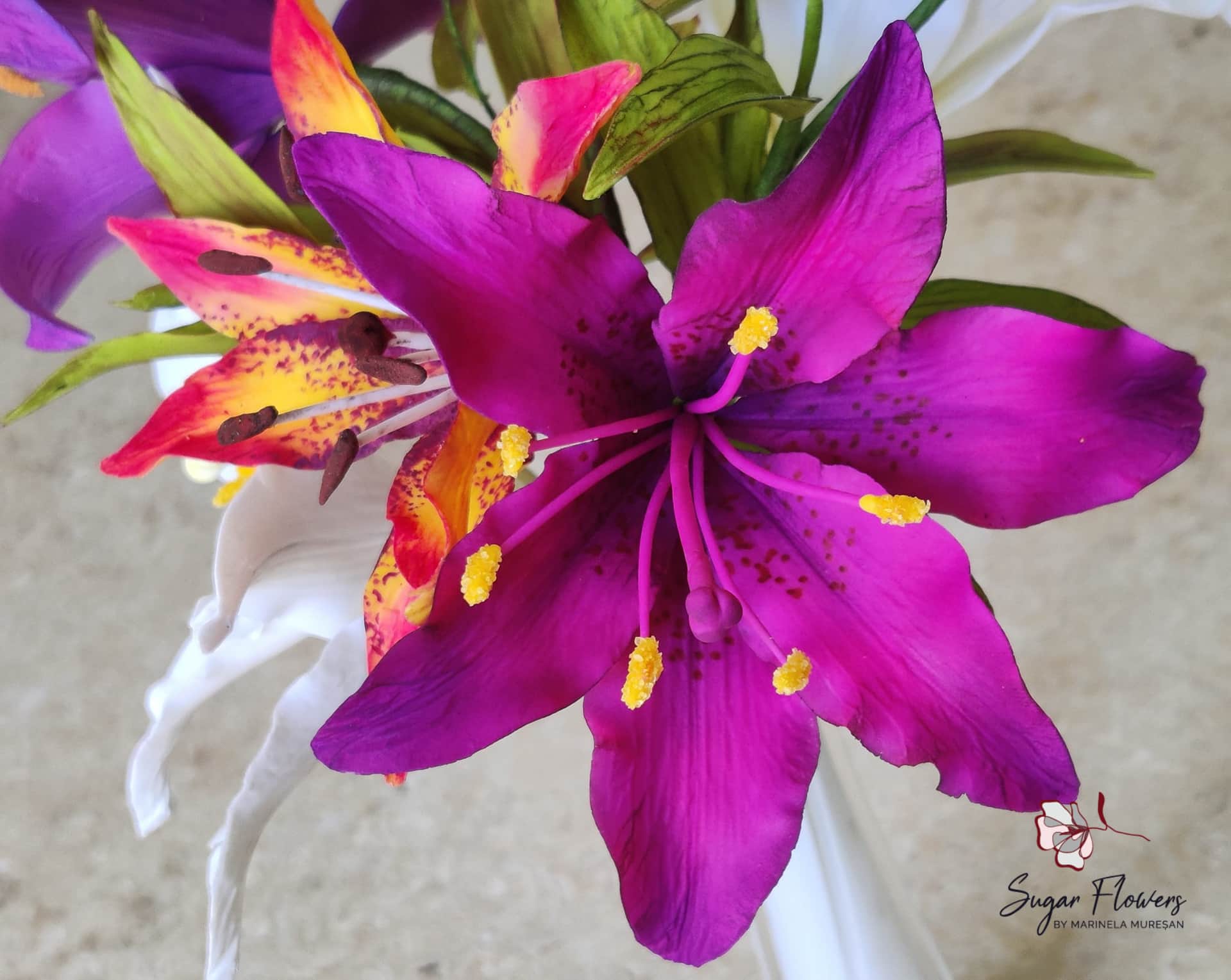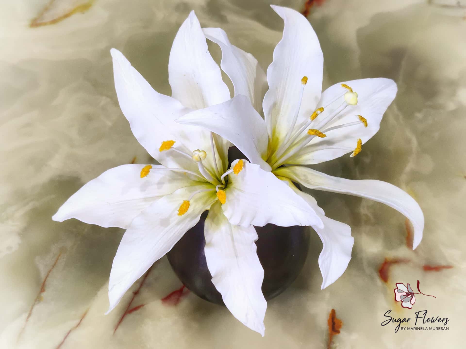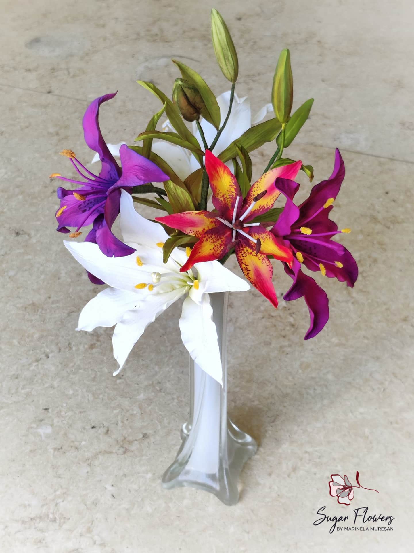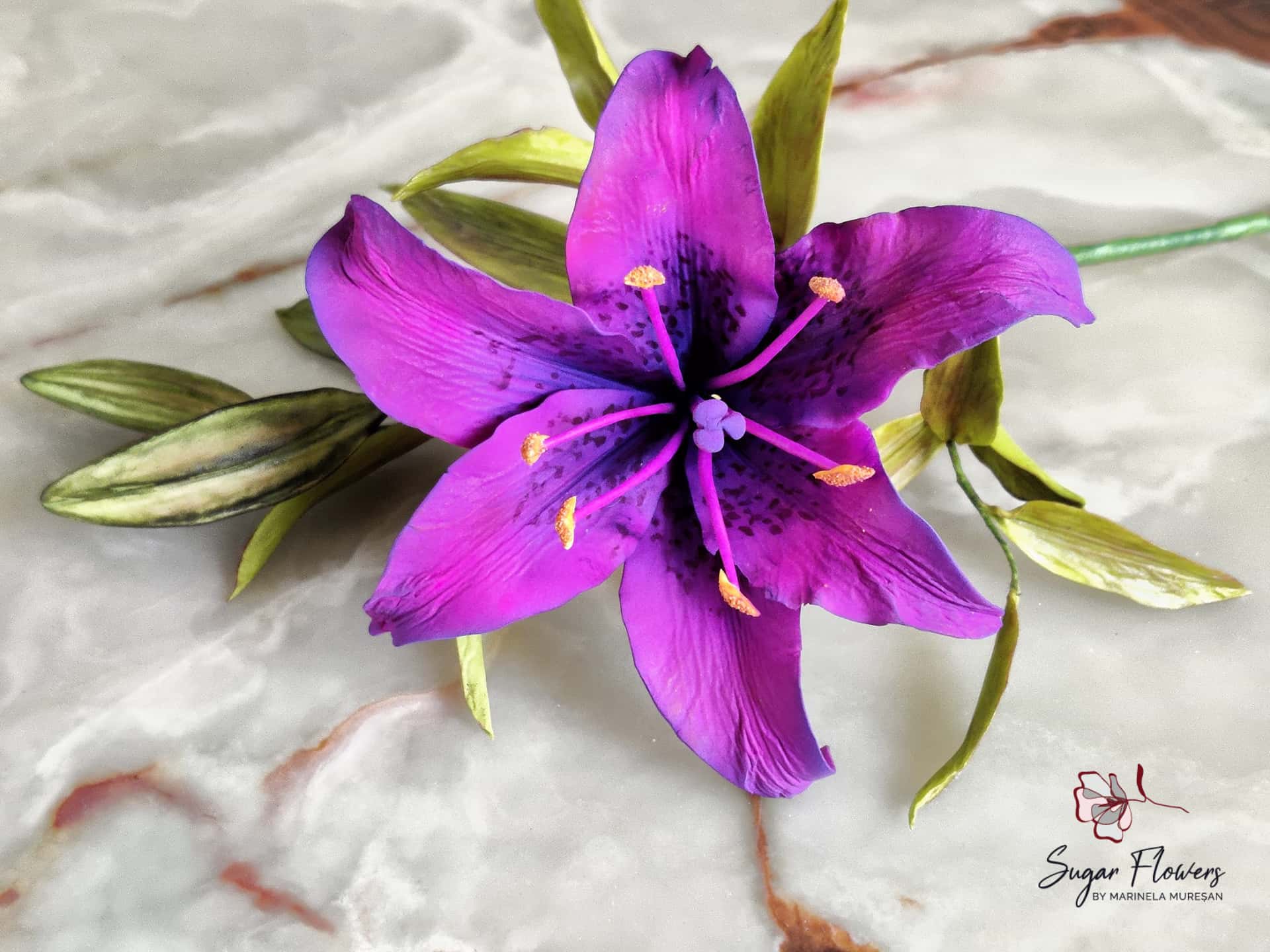 Crinul (Lilium regale) este o floare simpla, dar spectaculoasa prin forma si colorit. Pentru ca este o floare relativ mare, avand un diametru de aproximativ 15 cm, crinul este atractiv si foarte eficient pt.decorurile comestibile. Pentru modelarea unei astfel de flori, sunt necesare 6 petale, plus 2-3 frunze. Aspectul natural, realist al petalelor si frunzelor de zahar este dat de decupatoarele si veinerele(matritele) specifice utilizate. Culorile crinului asiatic sunt foarte variate, mergand de la alb pana la aproape negru. Eu am ales o combinatie de culori rosu-orange-galben, culori calde si pline de viata, care transmit bucurie si dau o stare de bine.