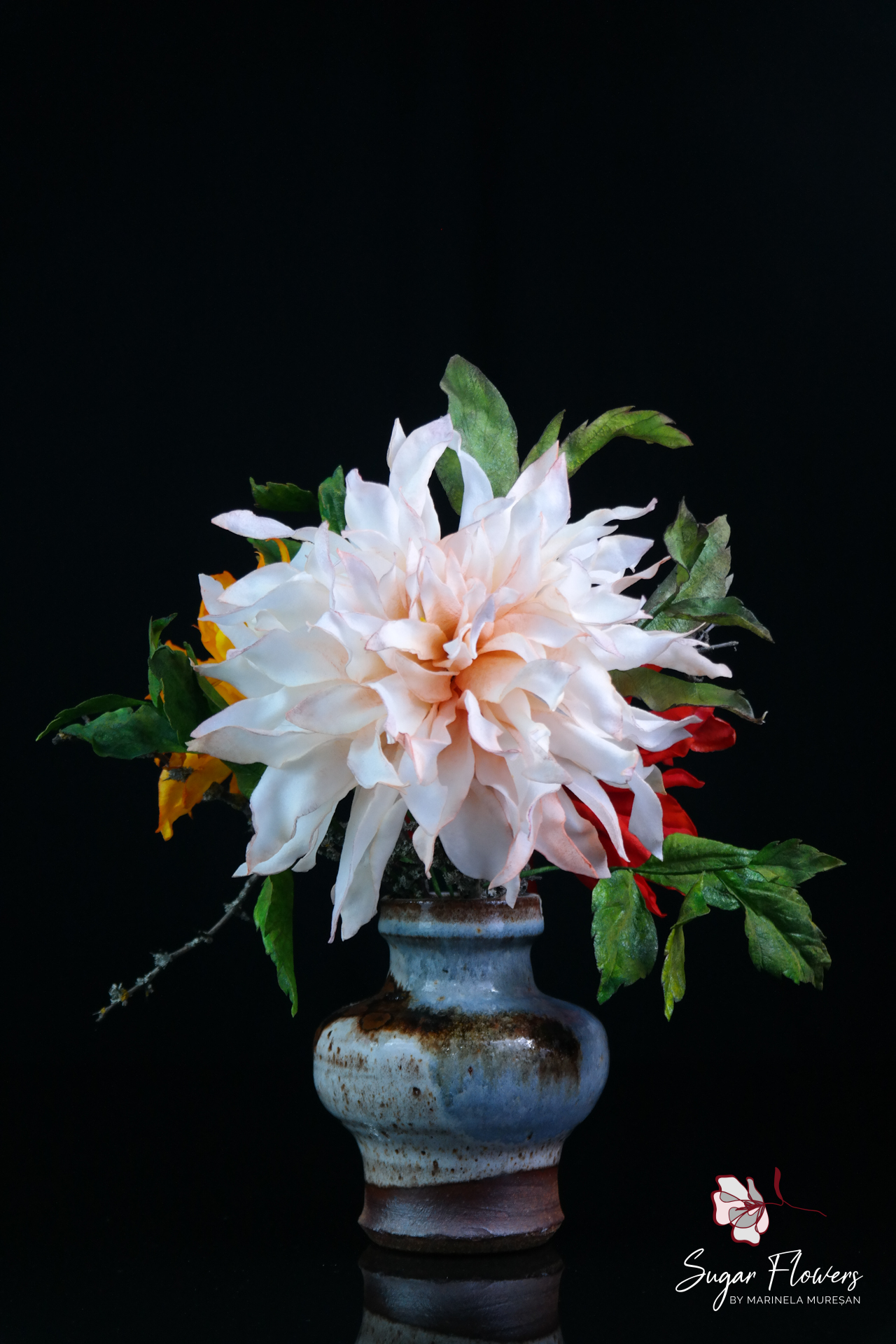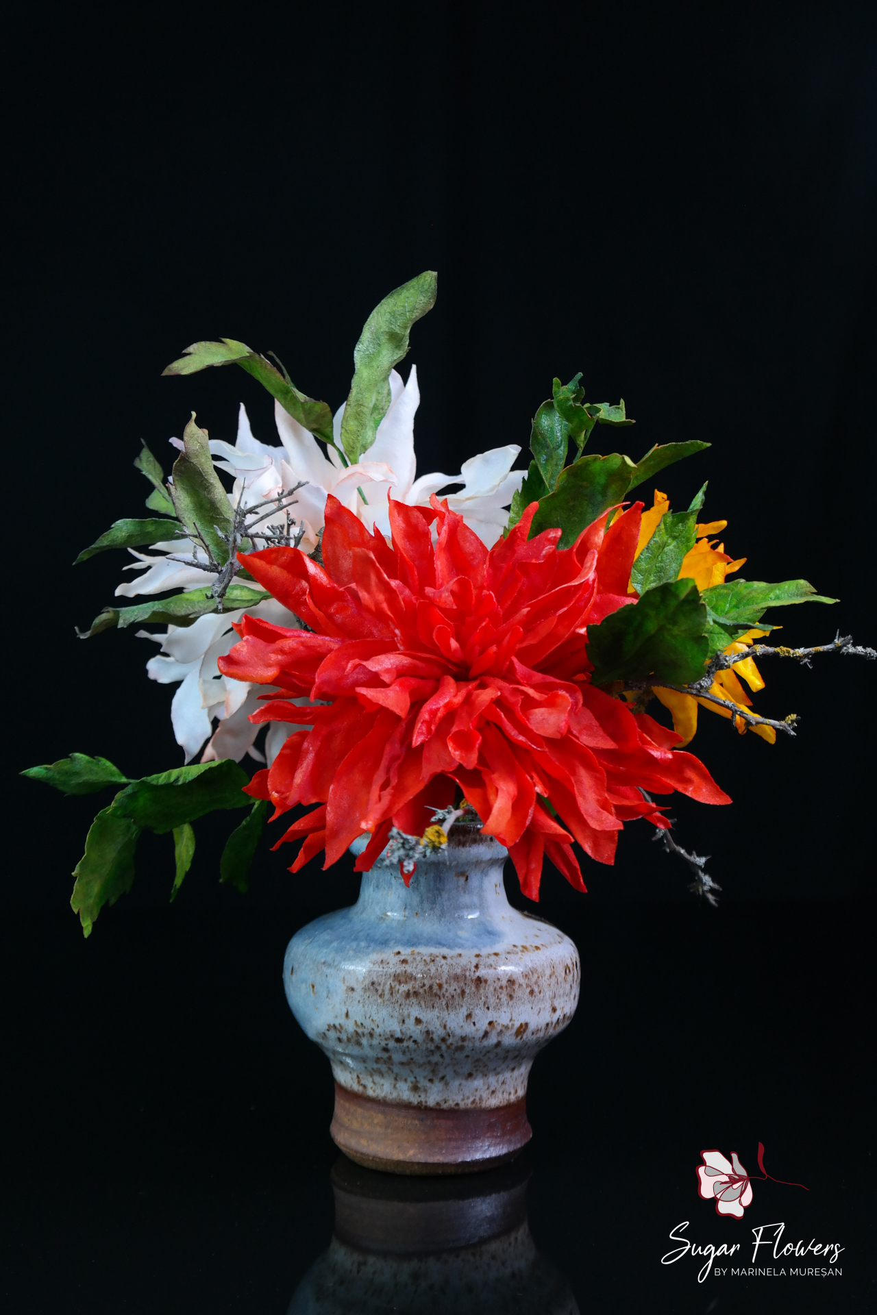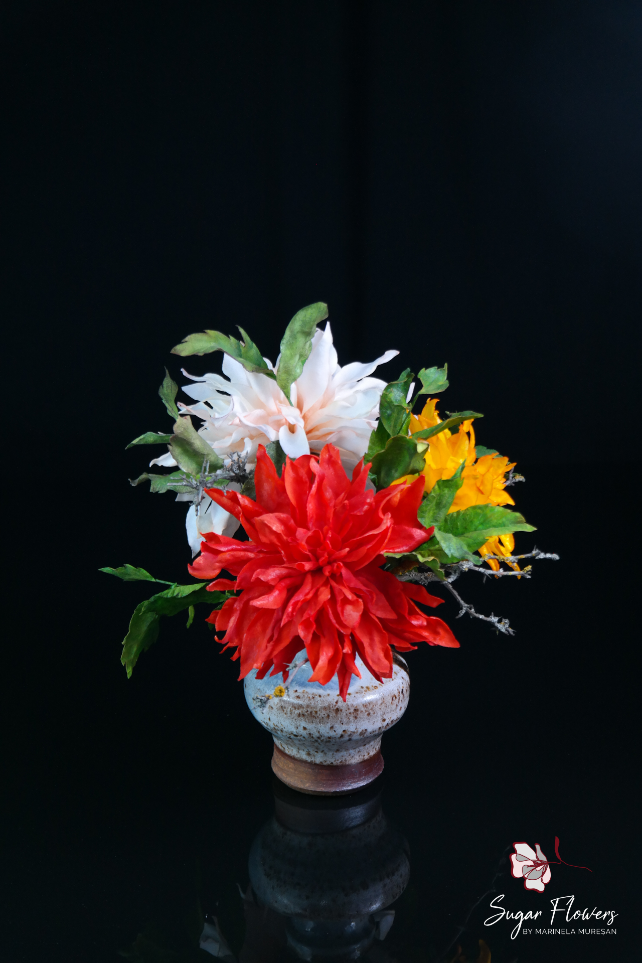 În realizarea acestei colecții de dalii din vafă, am dorit să surprind tocmai această diversitate și splendoare cromatică. Modelarea daliilor din vafă este un proces laborios, deoarece presupune tăierea și asamblarea manuală a fiecărei petale pentru a reda acea geometrie perfectă și acel volum spectaculos. Am ales să creez un buchet vibrant, combinând dalii în nuanțe de roșu aprins, galben solar și alb imaculat, pentru a aduce o notă de energie și optimism oricărui decor. Deși par robuste datorită formei lor generoase, daliile din vafă sunt extrem de ușoare, fiind perfecte pentru decorarea torturilor sau pentru crearea unor piese de centru spectaculoase. Sunt alegerea ideală pentru a aduce un strop din farmecul și forța toamnei direct pe masa de eveniment, transformând un simplu desert într-o operă de artă comestibilă.