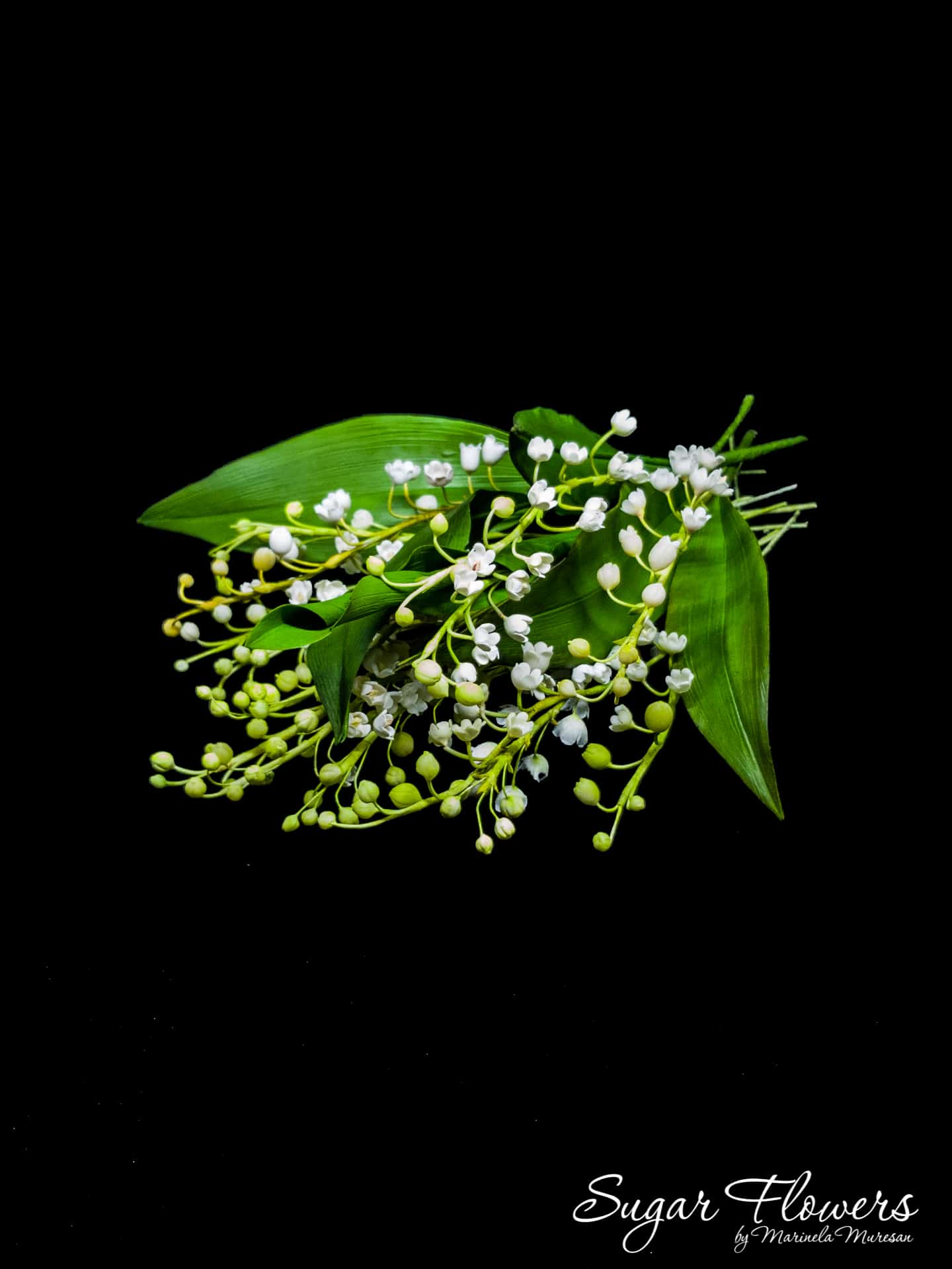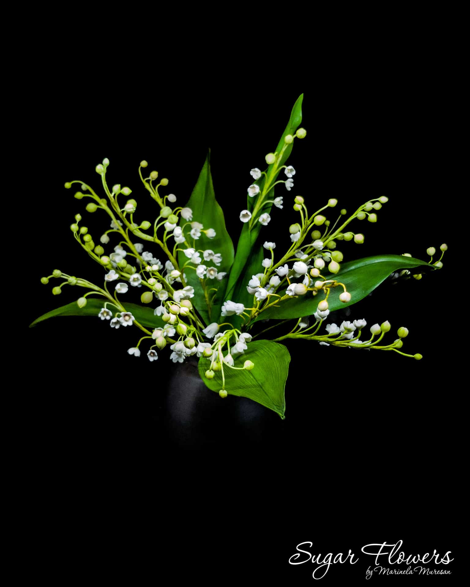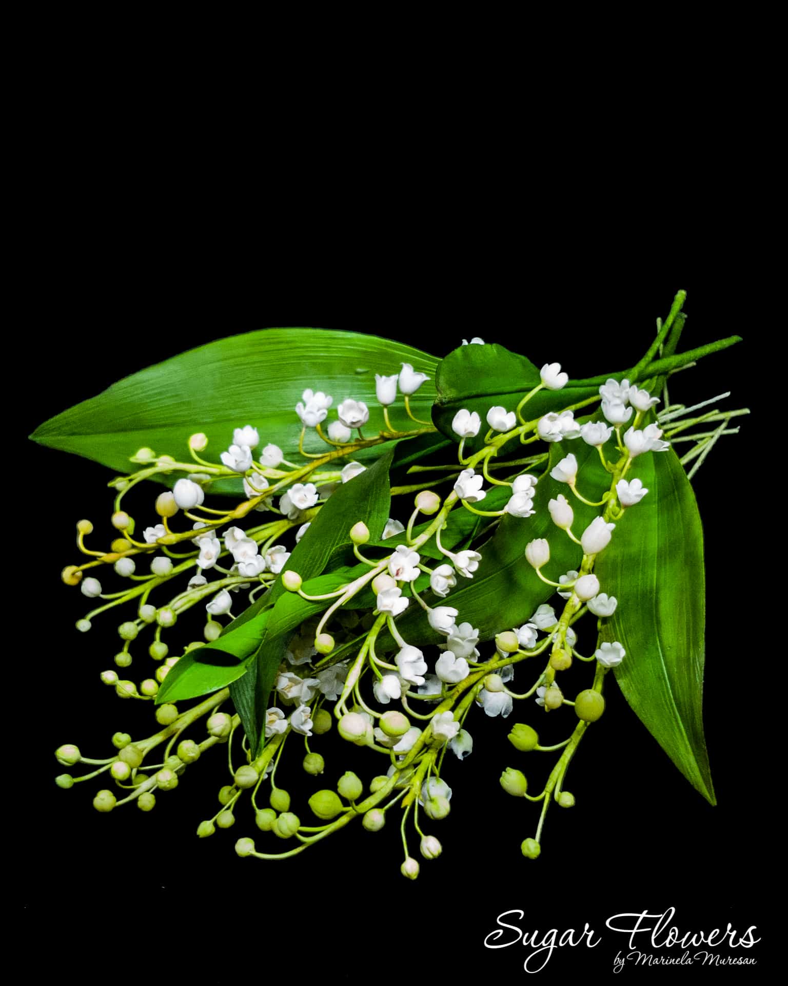 În imaginile de mai sus, această fragilitate efemeră a fost capturată pentru totdeauna. Lăcrămioarele pe care le vedeți nu sunt culese din grădină, ci sunt modelate manual, petală cu petală, din pastă de zahăr. Fiecare tijă a fost lucrată cu o atenție meticuloasă la detalii, respectând biologia florii reale: de la bobocii mici, verzi și strânși din vârful tijei, până la florile complet deschise, cu marginile fin dantelate. Frunzele late, cu nervuri paralele distincte, oferă contrastul perfect de verde crud care scoate în evidență albul imaculat al florilor, iar finisajul satinat al pastei imită perfect aspectul ceruit al plantei naturale.