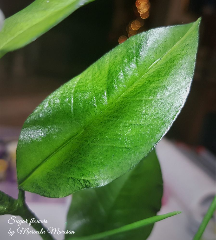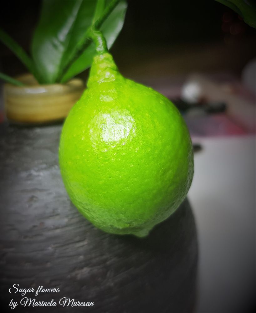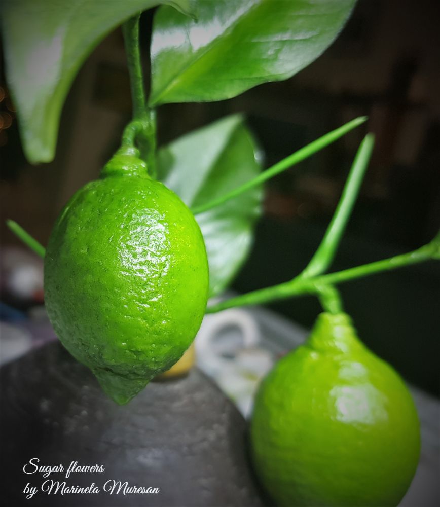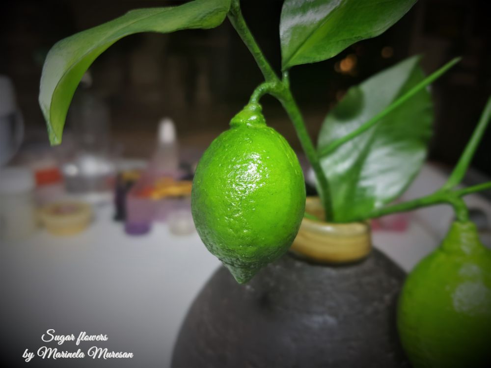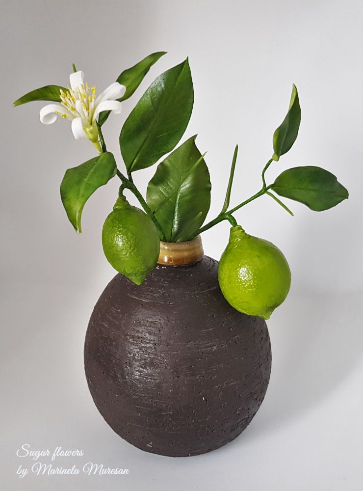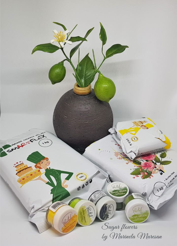 Ramura mea de lamai are o floare si doua fructe.Lungimea ramurii este de aproximativ 13 cm, iar fructele au diametrele de 2,5 si 4 cm. Floarea a fost inspirata de lamaiul propriu, care, in perioada de inflorire, imprastie un parfum foarte placut si imbietor, iar fructele le-am adaugat dupa ce am vazut o demonstratie a unuia dintre cei mai vizibili si mai apreciati instructori de flori din zahar, Robert Haynes. La editia din 2019 a evenimentului Cake International din Birmingham, Anglia, Robert H.a demonstrat realizarea unei lamai cu ajutorul unuia dintre veinerele marca proprie si a pastelor Smartflex.Combinatiile de paste pe care le-a folosit, rezultatul minunat al demonstratiei m-a provocat. La intoarcerea acasa, pentru ca tot aveam fructe pe lamaiul propriu, mi-am realizat matritele cu care am lucrat. Pastele Smartflex tocmai ajunsesera si pe piata romaneasca, asa ca am putut aplica informatiile primite cu rezultate foarte multumitoare pentru mine.