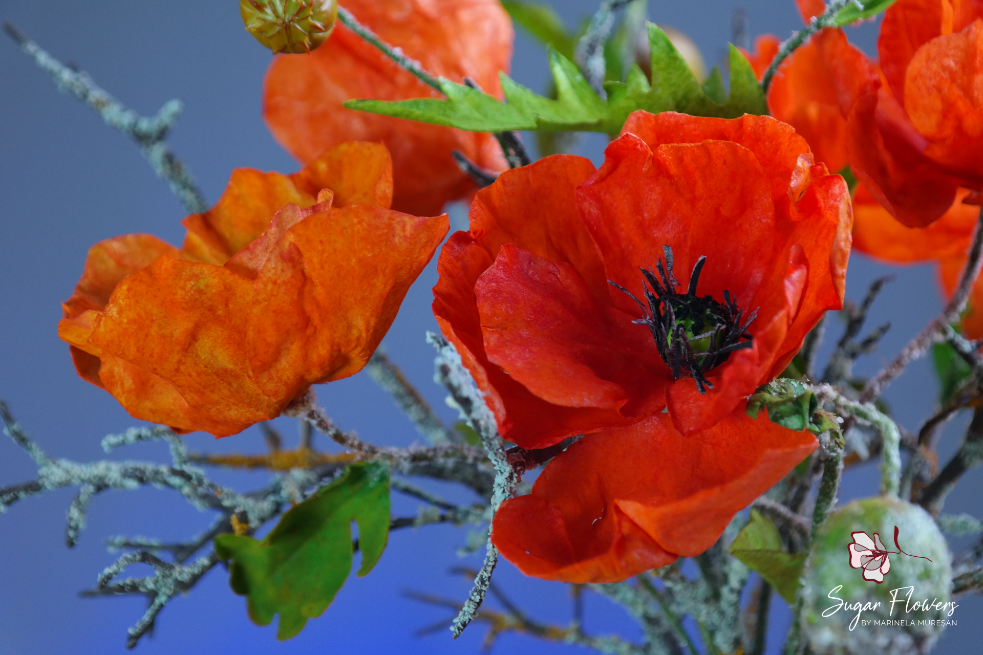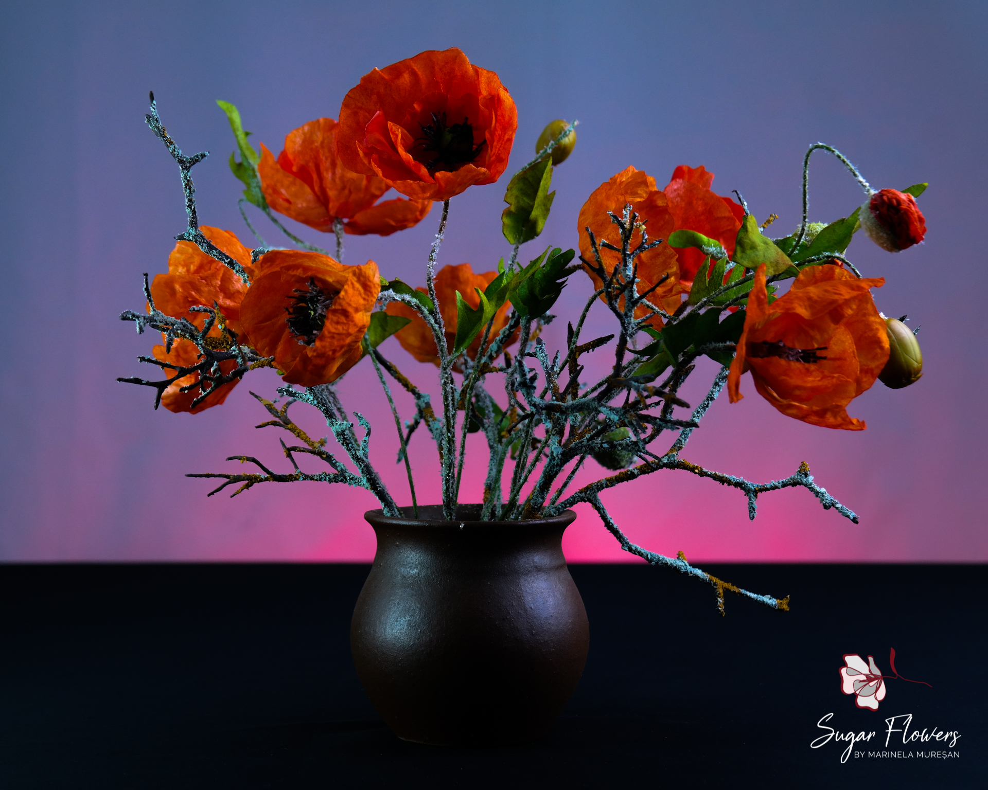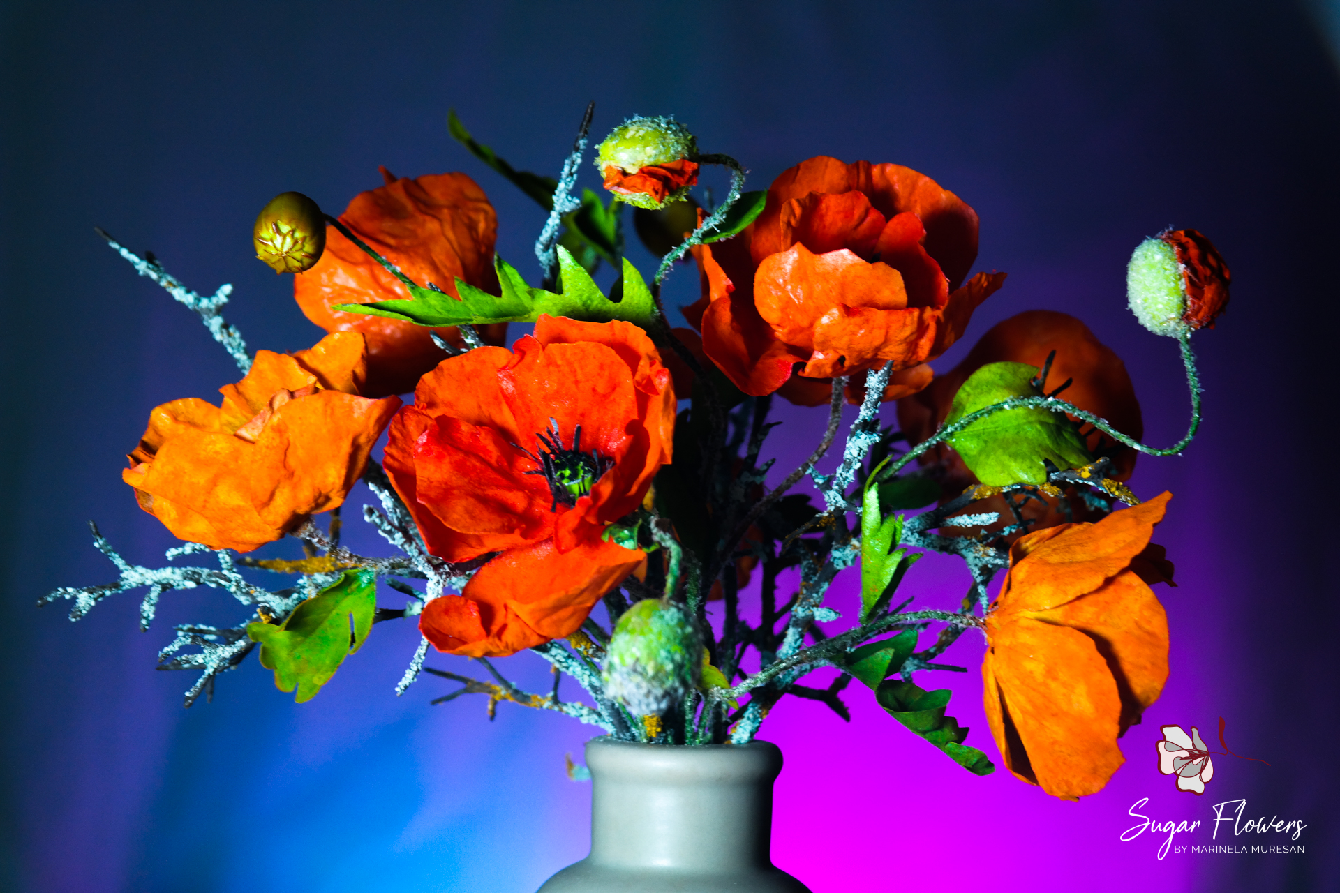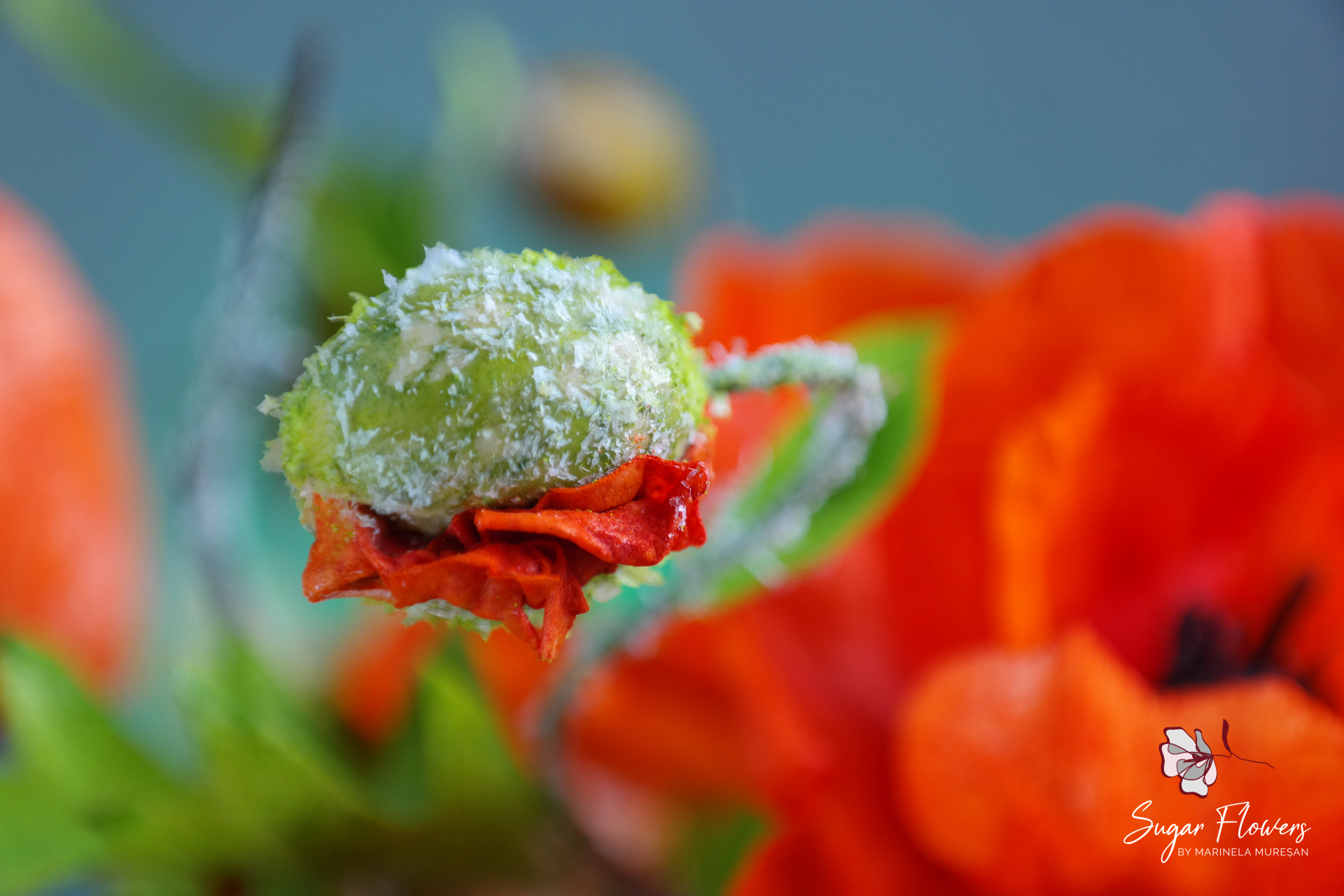 Macul meu din vafa este o floare care se lucreaza rapid datorita numarului redus de petale. Poate decora el insusi un tort, la fel de bine cum poate intra in diverse aranjamente florale, alaturi de alte specii de camp.Are o forma de cupa, formata din petale aranjate alternativ, pe doua randuri. Petalele macului sunt extrem de subtiri si delicate, delicatete care poate fi foarte frumos redata de foile de vafa.Forma florii este ajustabila datorita petalelor care sunt montate pe sarma si care pot fi aranjate in functie de nevoile specifice.