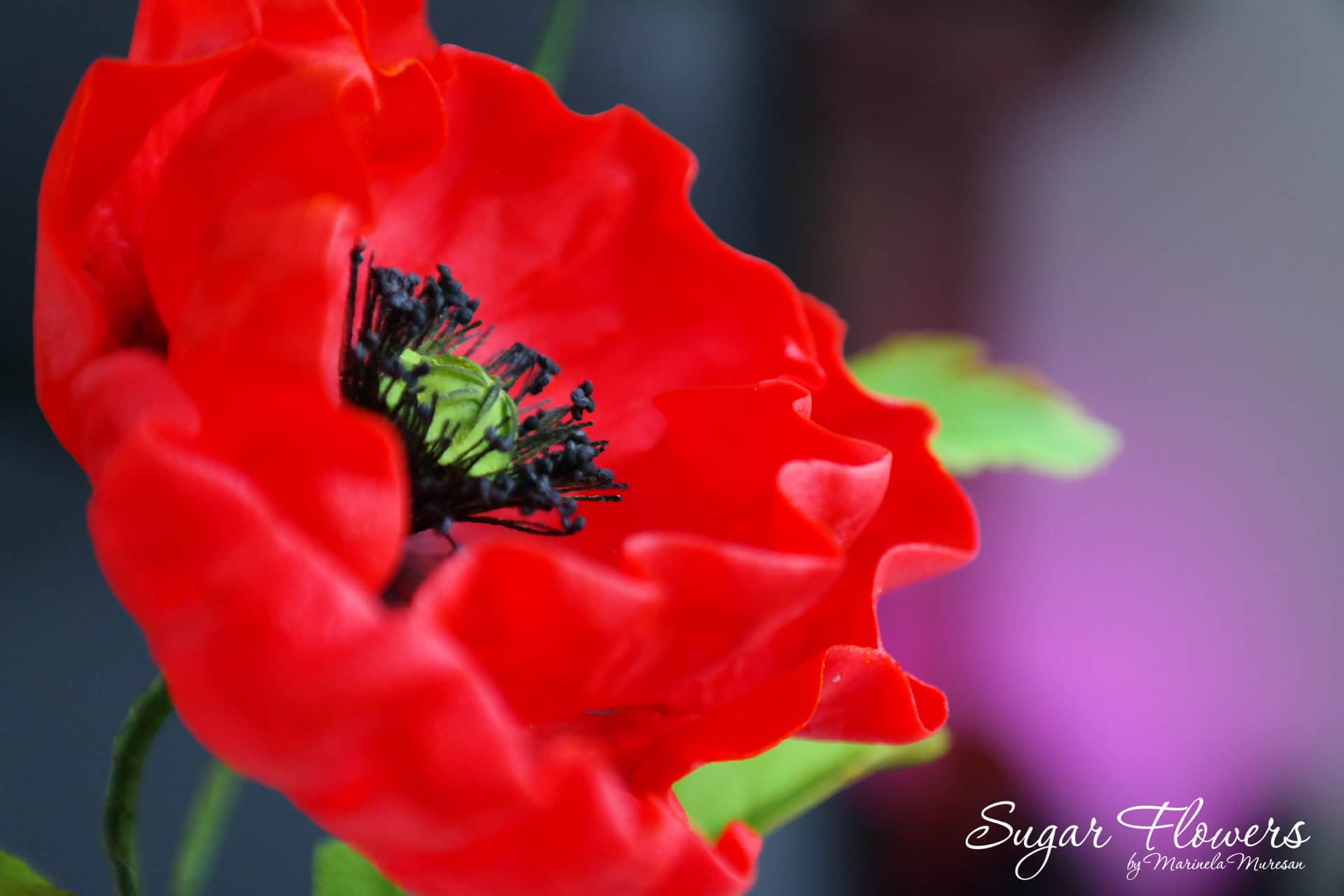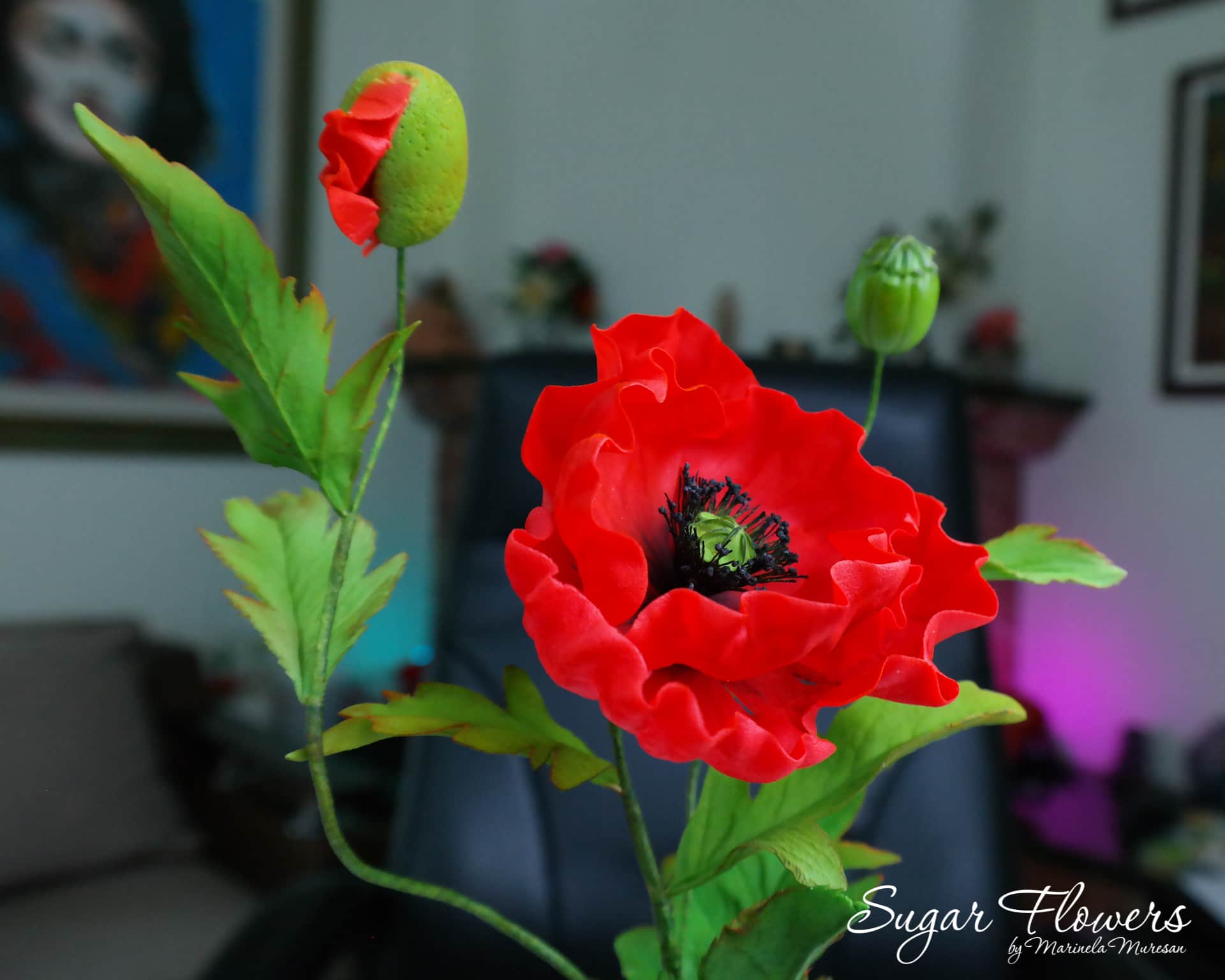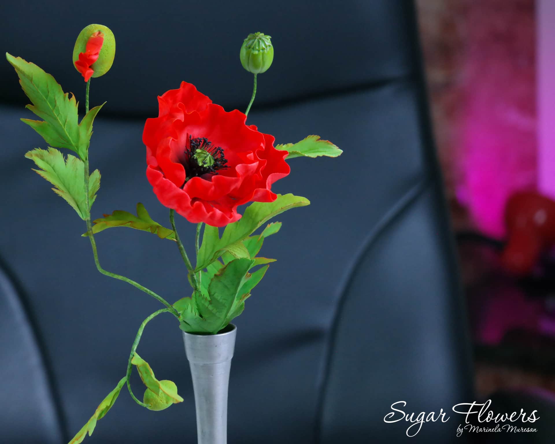 Macii din imagine sunt modelati din trei materiale diferite: pasta de zahar, portelan rece si foi de vafa. La momentul realizarii lor, voiam sa experimentez materiale diferite pentru a intelege cat mai bine specificul fiecaruia dintre ele, prin comparatie, si pentru a gasi materialul cel mai adecvat, capabil sa redea finetea si delicatetea acestei flori. Imaginea respectiva a si fost publicata alaturi de o provocare pentru a ghici fiecare mac din ce material este. Desi la prima vedere macii par identici sau foarte asemanatori, in realitate, textura lor e diferita. La fel si greutatea. Macii din vafa sunt cei mai usori si au petalele cele mai delicate si asemanatoare macilor naturali.