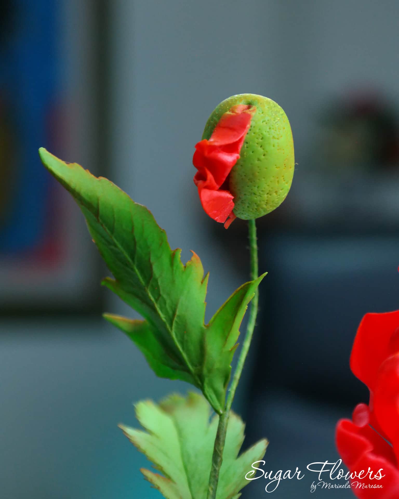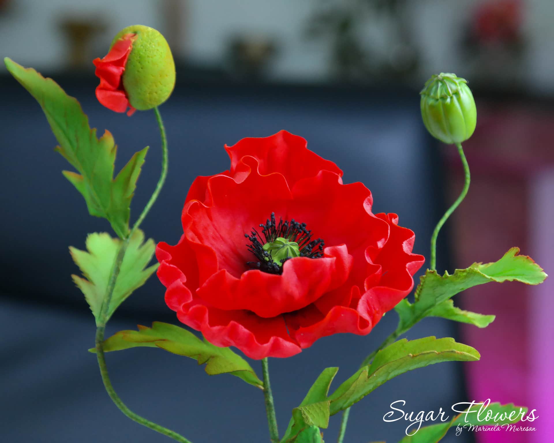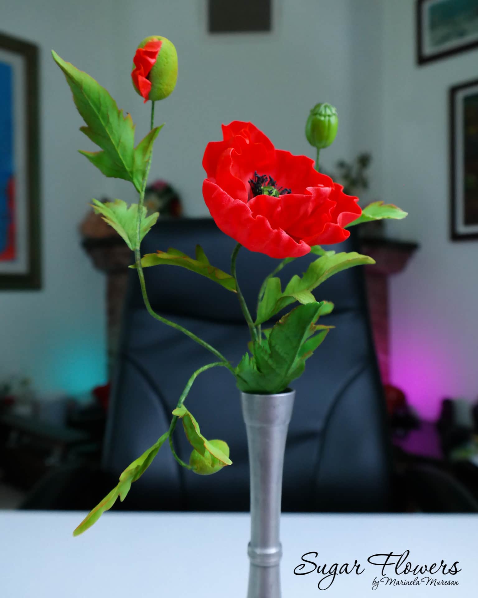 Macii din imagine sunt modelati din trei materiale diferite: pasta de zahar, portelan rece si foi de vafa. La momentul realizarii lor, voiam sa experimentez materiale diferite pentru a intelege cat mai bine specificul fiecaruia dintre ele, prin comparatie, si pentru a gasi materialul cel mai adecvat, capabil sa redea finetea si delicatetea acestei flori. Imaginea respectiva a si fost publicata alaturi de o provocare pentru a ghici fiecare mac din ce material este. Desi la prima vedere macii par identici sau foarte asemanatori, in realitate, textura lor e diferita. La fel si greutatea. Macii din vafa sunt cei mai usori si au petalele cele mai delicate si asemanatoare macilor naturali.
