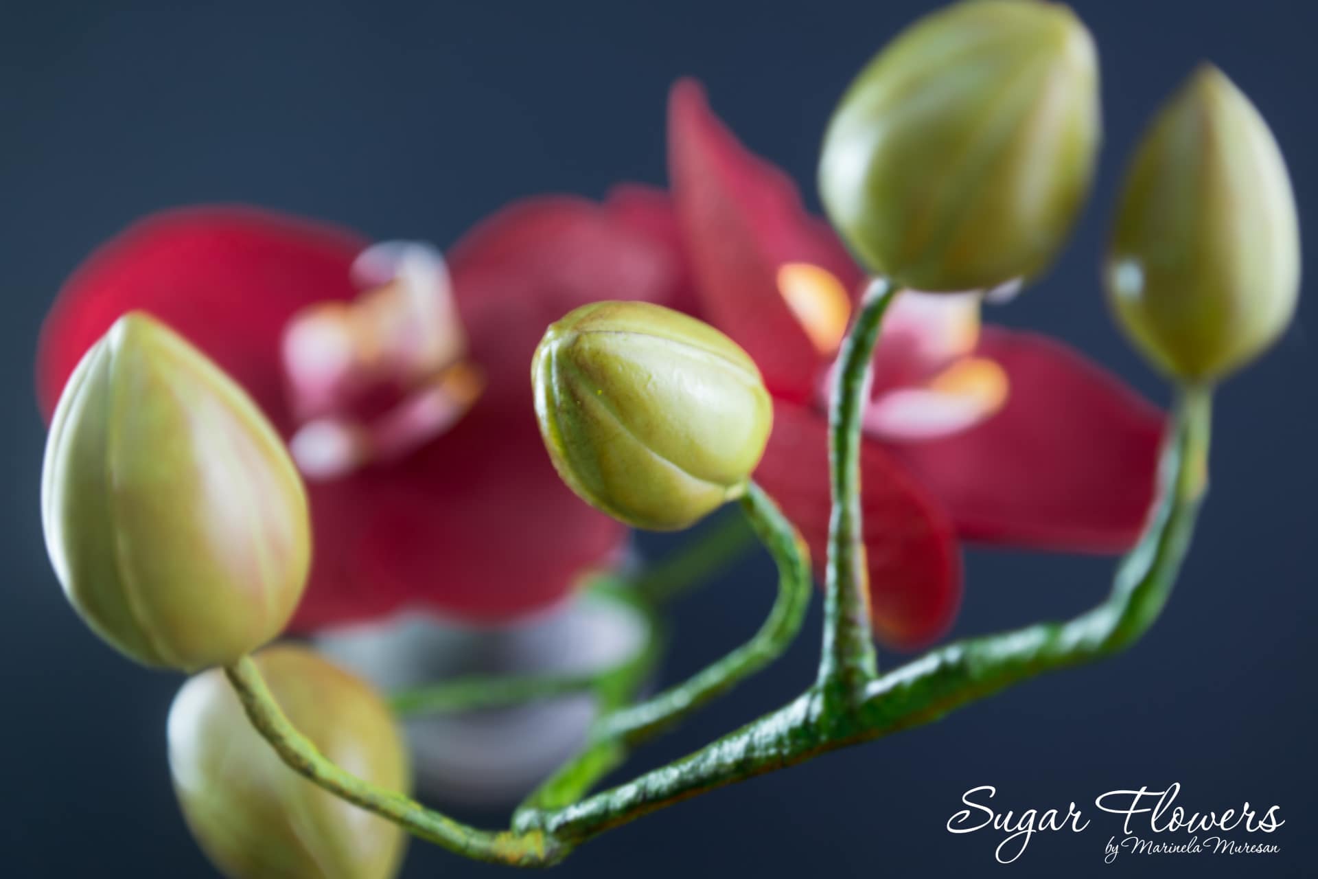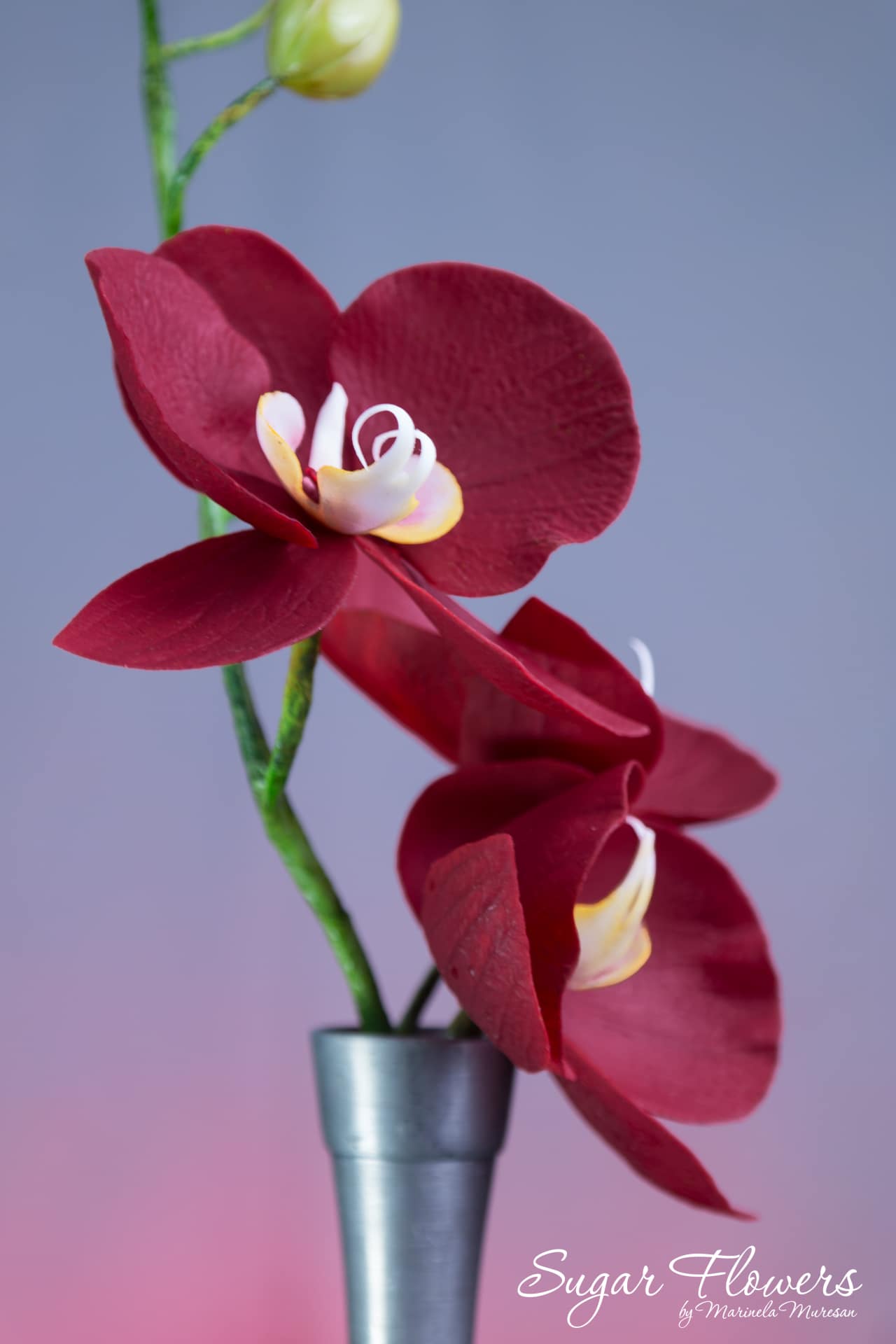 O floare de orhidee este formata din petale, sepale, labellum (buza) si columna. Labellum este o petala modificata care serveste drept "platforma de aterizare" pentru polenizatori. Columna este structura centrala, cilindrica, formata prin fuziunea partilor masculine (stamine) si feminine (pistil), fiind unica in lumea plantelor, conform Wikipedia. Ultimele doua componente formeaza partea centrala a florii. Pentru a reda aspectul realist al florii, folosim decupatoare si veinere (matrite) specifice. (link)