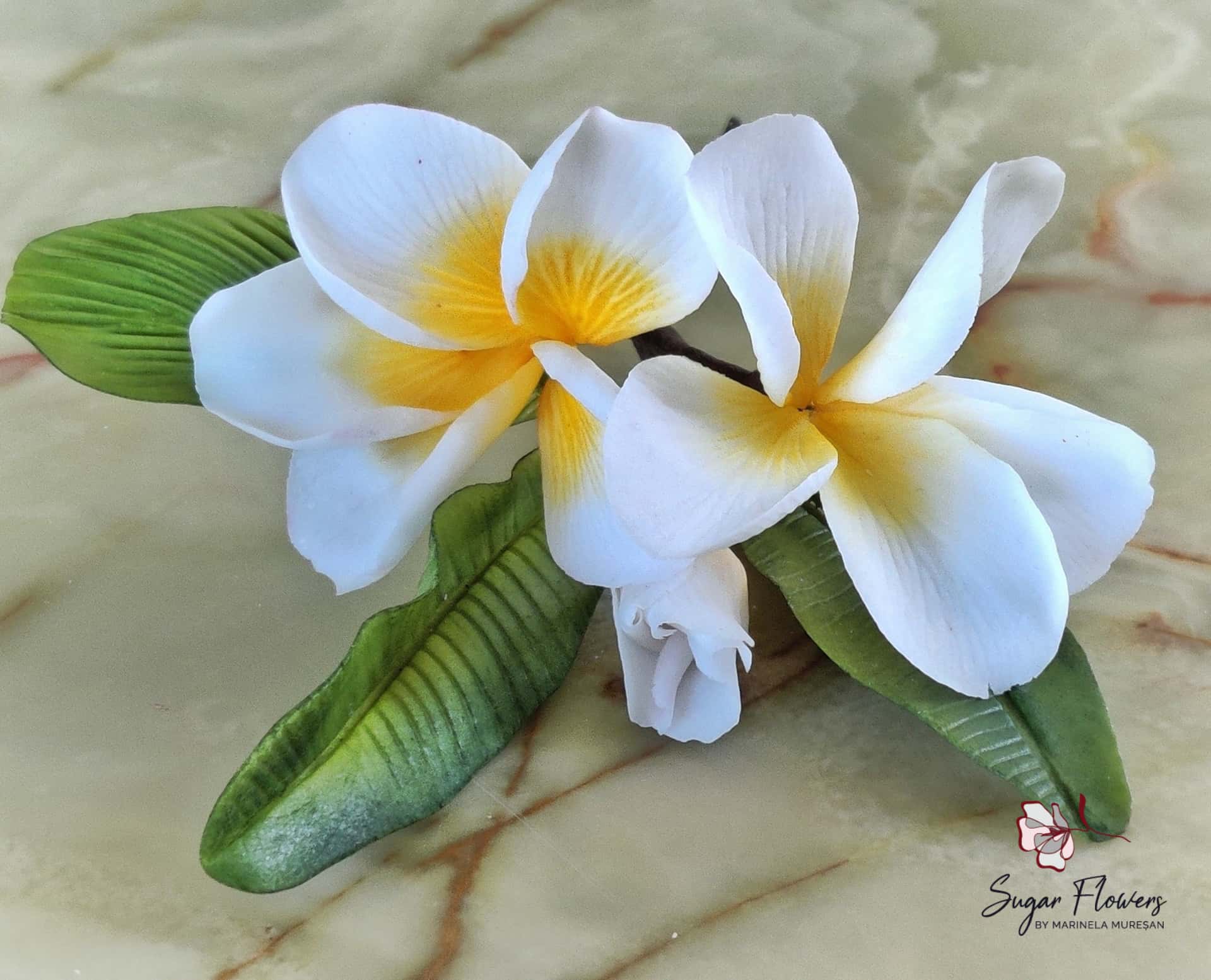 Florile de Plumeria pe care le-am realizat din pastă de zahăr încearcă să surprindă tocmai acest realism exotic și echilibrul perfect al formelor. Am acordat o atenție deosebită texturii petalelor și tranzițiilor cromatice realizate prin pictură manuală, pentru a reda acel aspect proaspăt, „abia cules”. Deși este o floare cu linii simple și moderne, detaliile fine o transformă în piesa centrală a oricărui tort sau aranjament, oferind o estetică nobilă și luxuriantă. Este alegerea ideală pentru decorurile de nuntă pe plajă, petreceri tematice de vară sau pentru orice moment în care doriți să aduceți magia tropicelor direct pe masa de eveniment.
