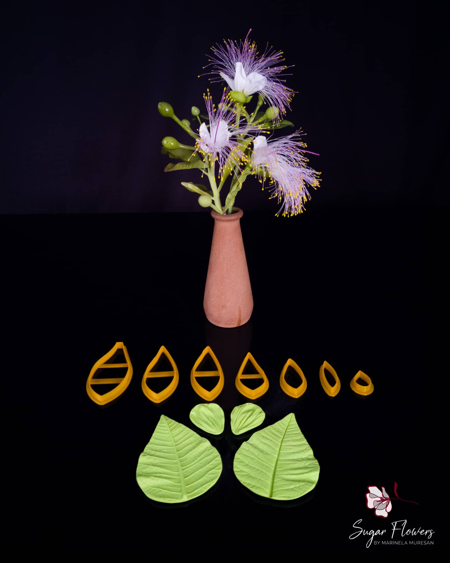 Pentru a reproduce corect acest look in flori din zahar, ai nevoie de doua lucruri: forme coerente si textura discreta, astfel incat detaliile (mai ales zona centrala) sa arate elegant, nu incarcat.