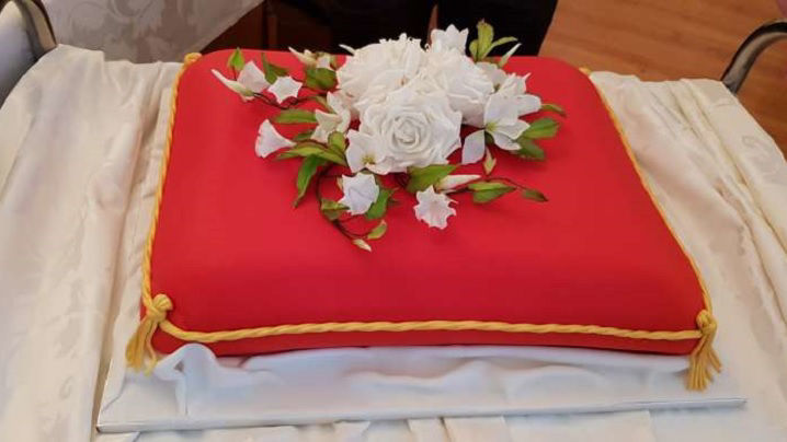 In cadrul zilei de duminica, dupa servirea pranzului, Papa Francisc a primit un tort special pregatit, conceput la Beclean, reprezentand o perna rosie decorata cu trandafiri albi.