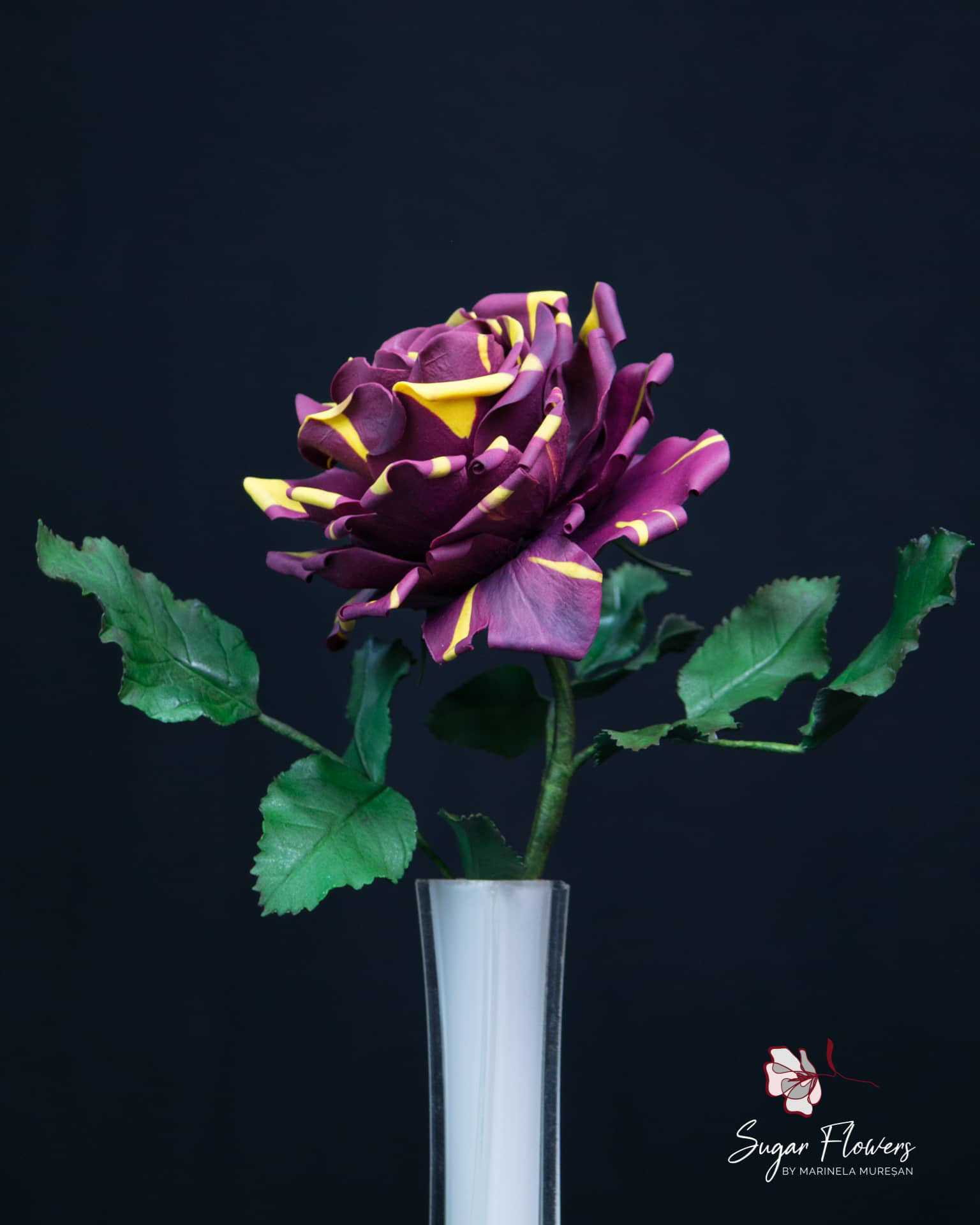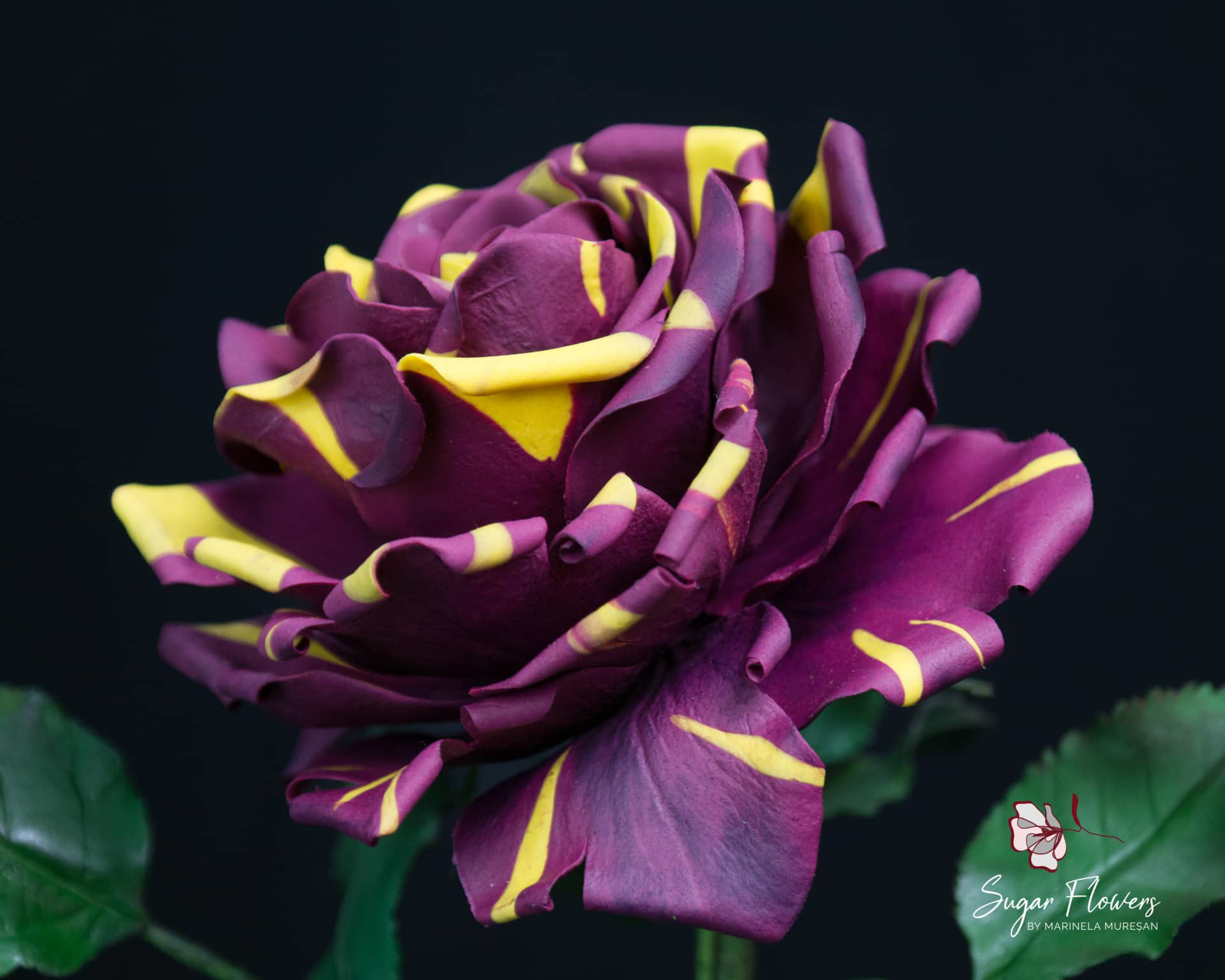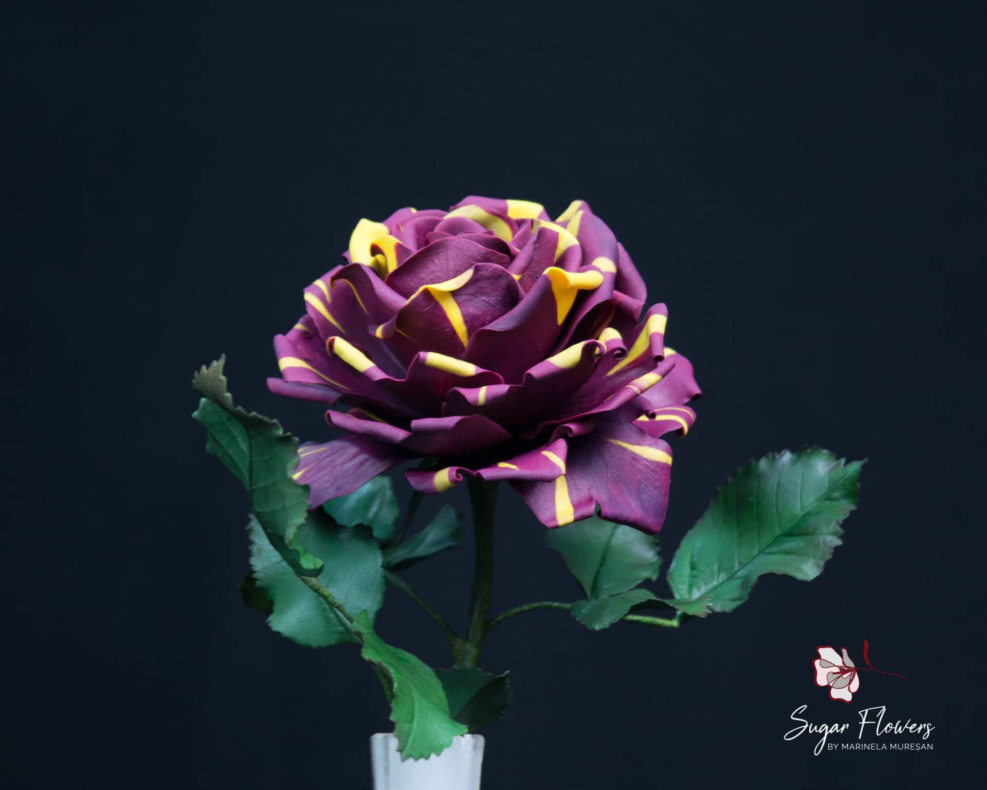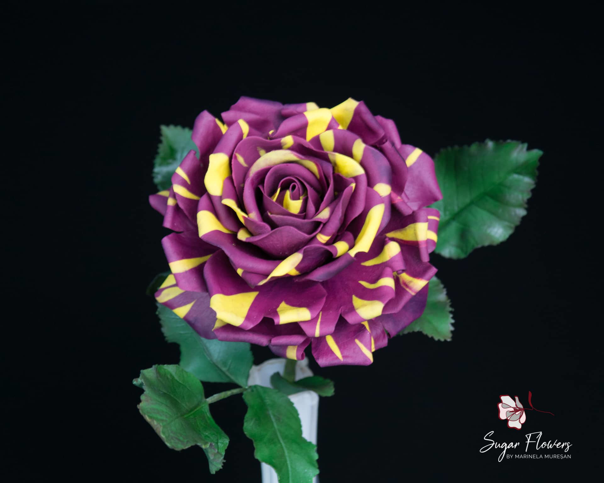 Modelul ales este acela de trandafir pestrit, numit Hocus-Pocus sau Abracadabra. Culorile sunt contrastante, galben si burgundy, iar pasta este una inovativa, flexibila, obtinuta din tapioca.