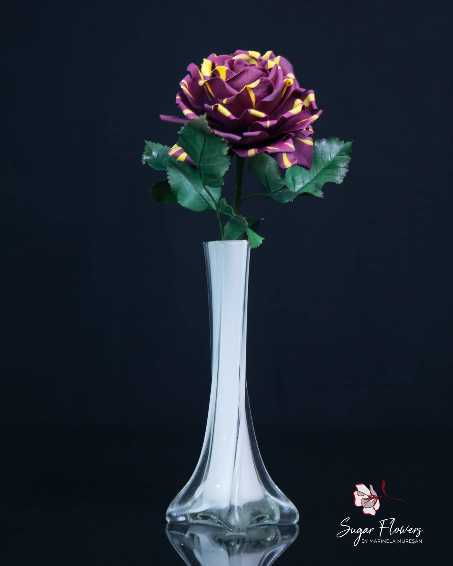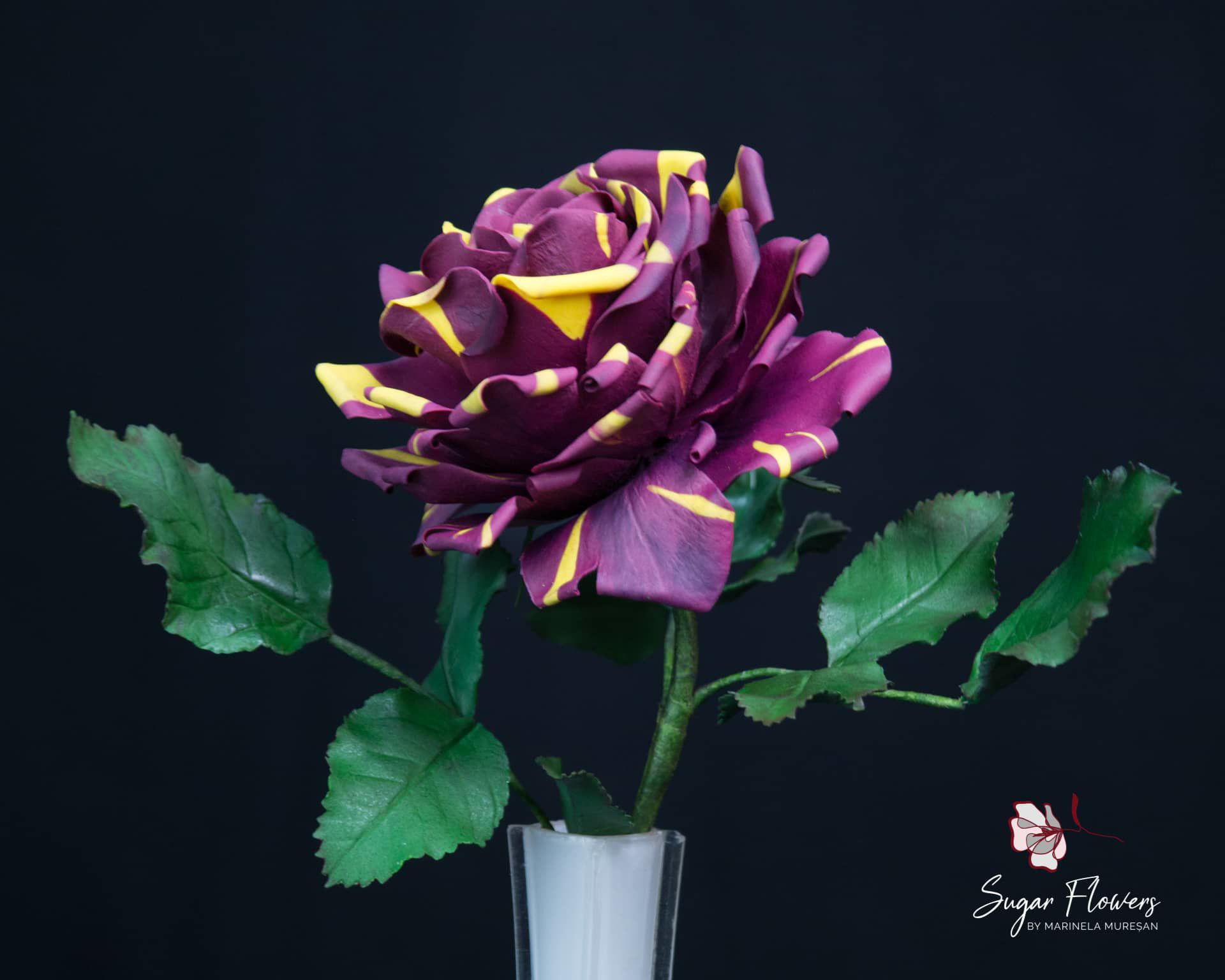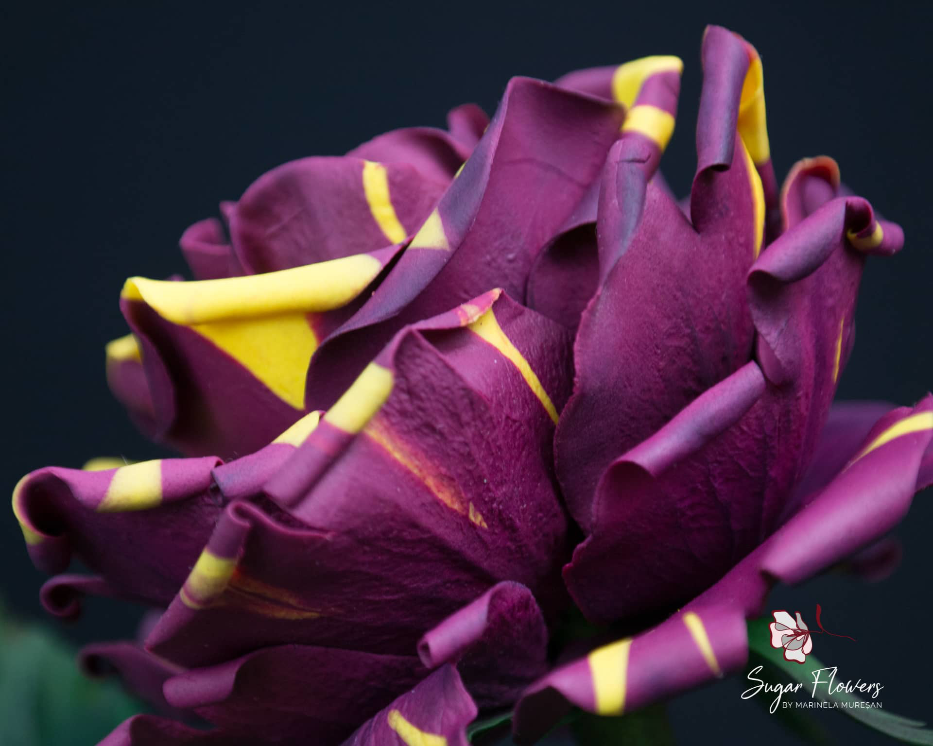 Modelul ales este acela de trandafir pestrit, numit Hocus-Pocus sau Abracadabra. Culorile sunt contrastante, galben si burgundy, iar pasta este una inovativa, flexibila, obtinuta din tapioca.