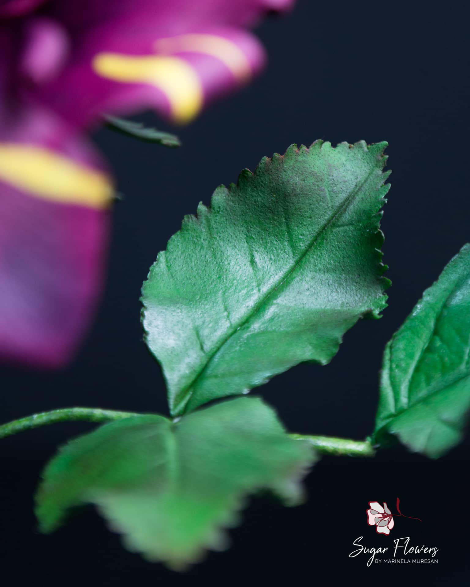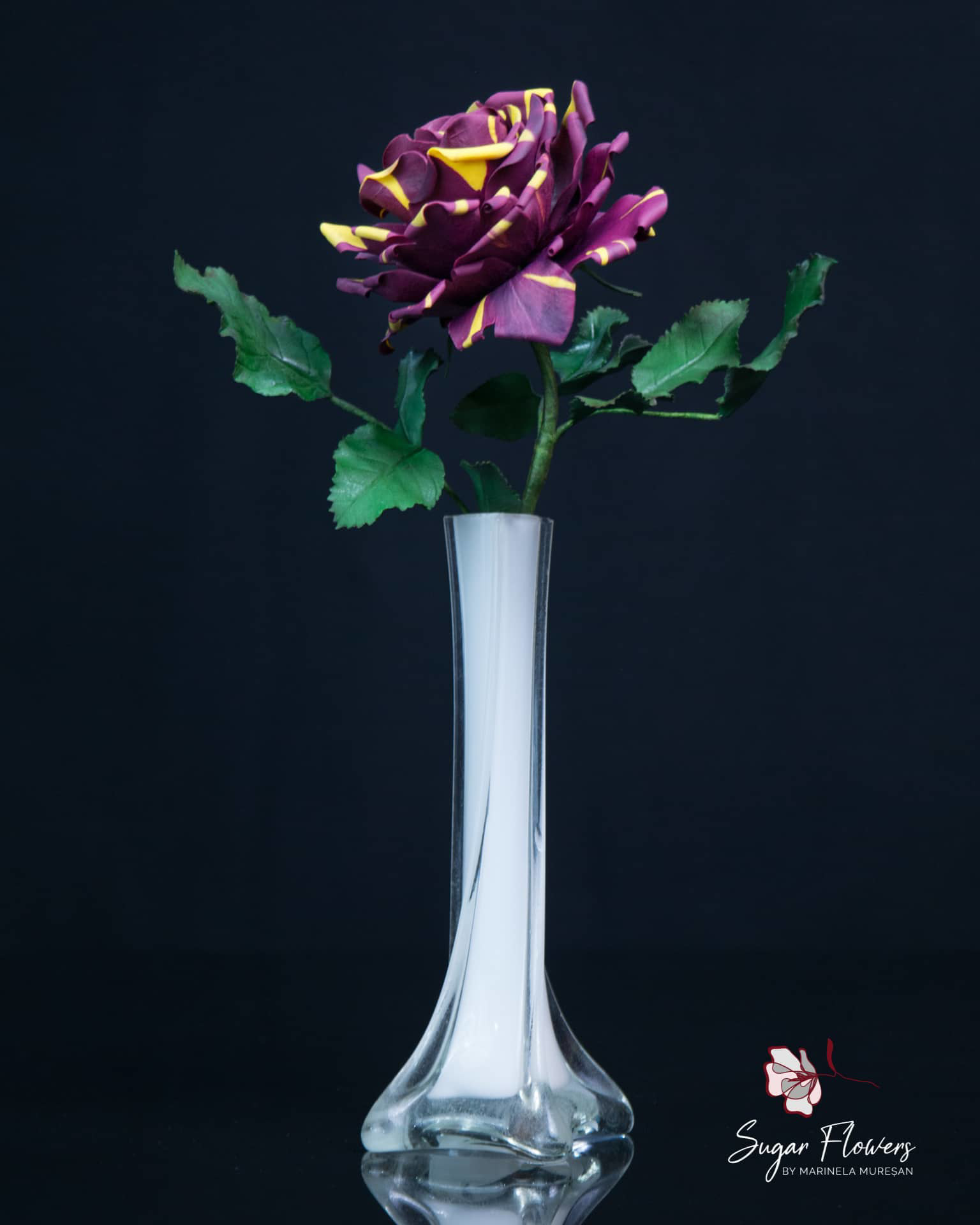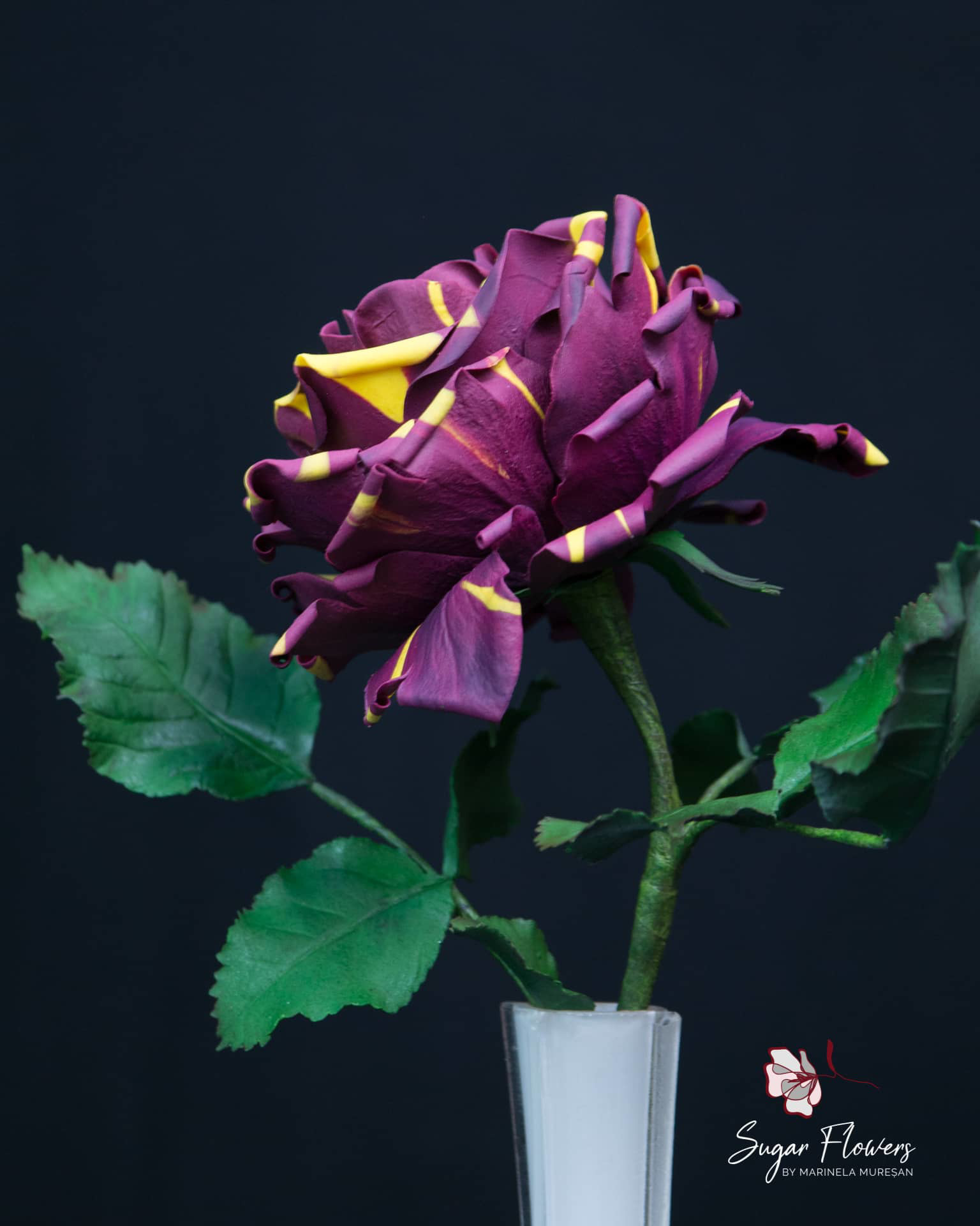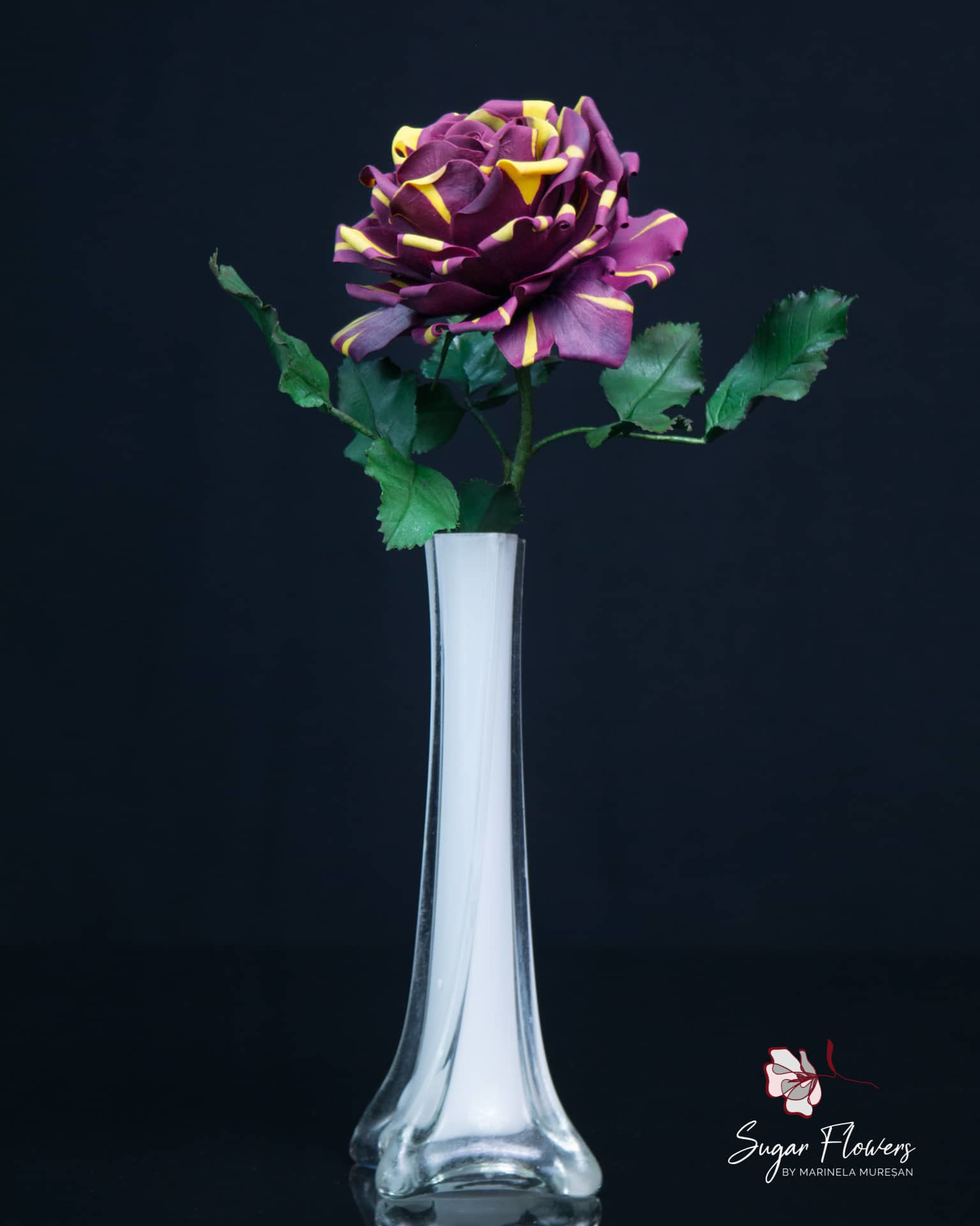 Modelul ales este acela de trandafir pestrit, numit Hocus-Pocus sau Abracadabra. Culorile sunt contrastante, galben si burgundy, iar pasta este una inovativa, flexibila, obtinuta din tapioca.